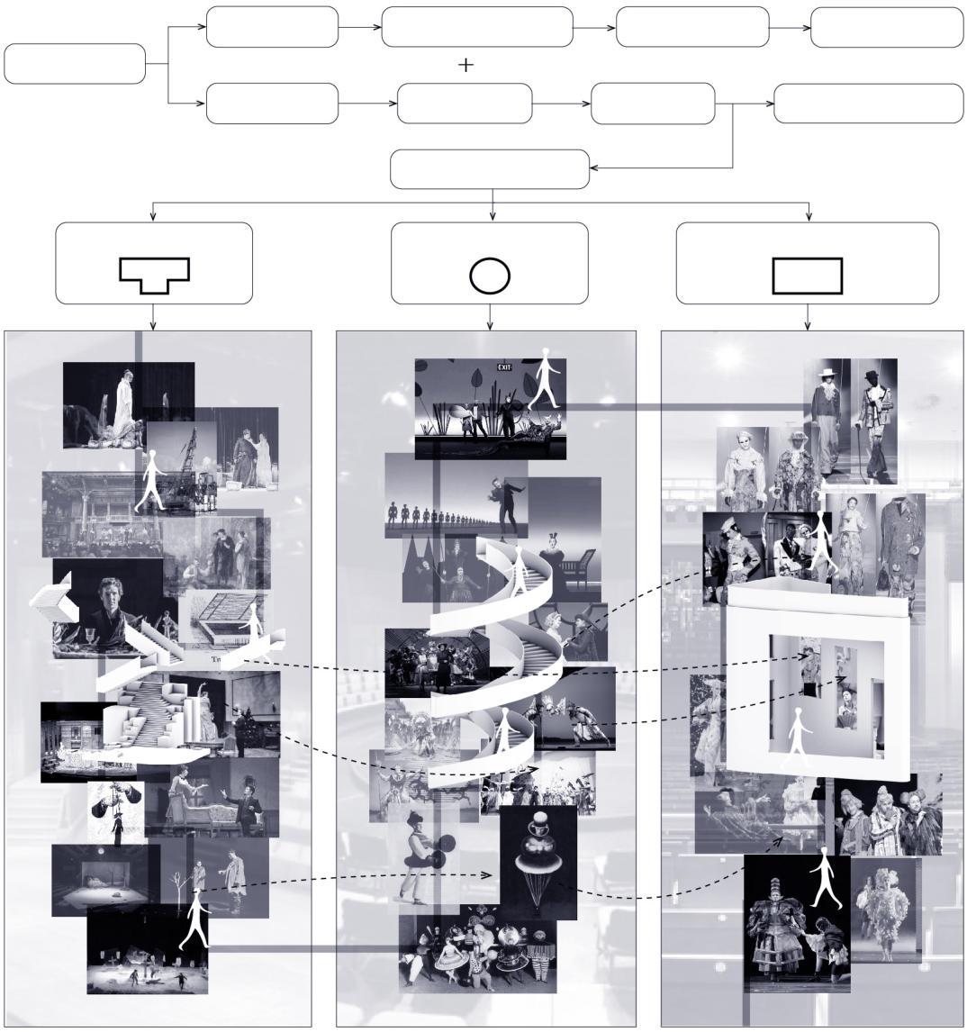 Spatially, it combines an extended stage and uses a staggered approach to allow the audiencetotravelbackandforthtodi erent periods to closely observe the stage play costumes.