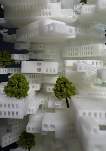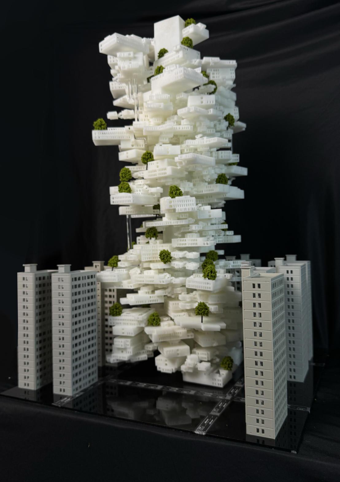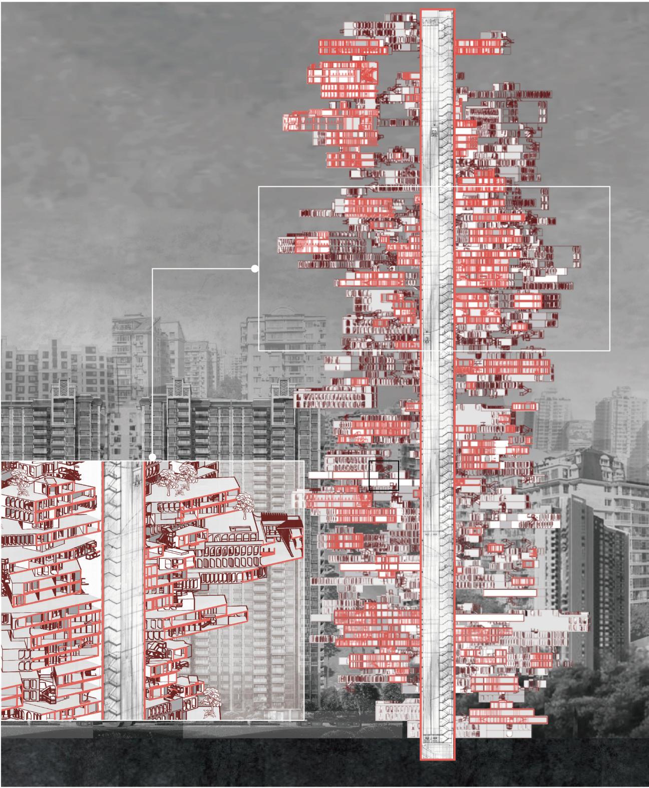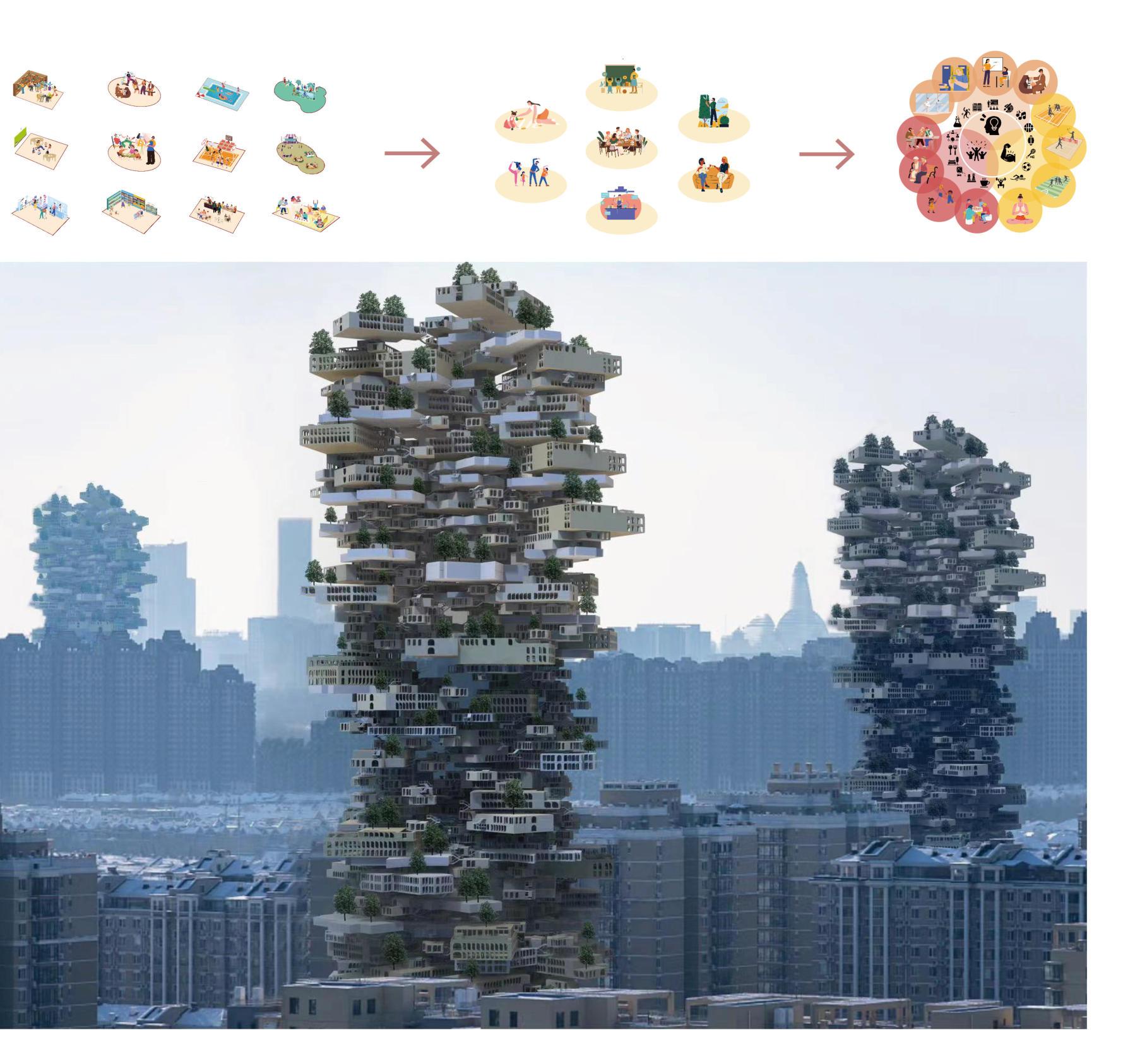 Thisisaconstructionmodelthatcanbe in nitelyreplicated.Whenencountering areaswiththesameproblems,itprovides moreresidentialcommunitiesforpeople andreducestheproblemofdensehousing. Thisbuildingisaverylargestructure.It formsasharpcontrastwiththeverydense residentialbuildingsaround.
