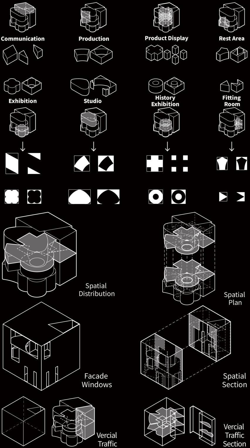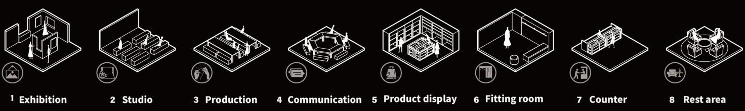 Theexhibitionhallisdividedintothreesections,eachofwhichintegratesdi erentformsofstagedesign styles.Theclothingexhibitionisalsodistributedindi erentexhibitionhallsaccordingtothedi erentvisual experiencesitaimstobringtopeople.Asectioninthemiddleisreservedforvariousactivities,suchas fashionshows.Theexhibitionhallsareconnectedbycorridors,allowingpeopletowalkalongtheroutesthey like,whichcanbringavarietyofdi erentexperiences.