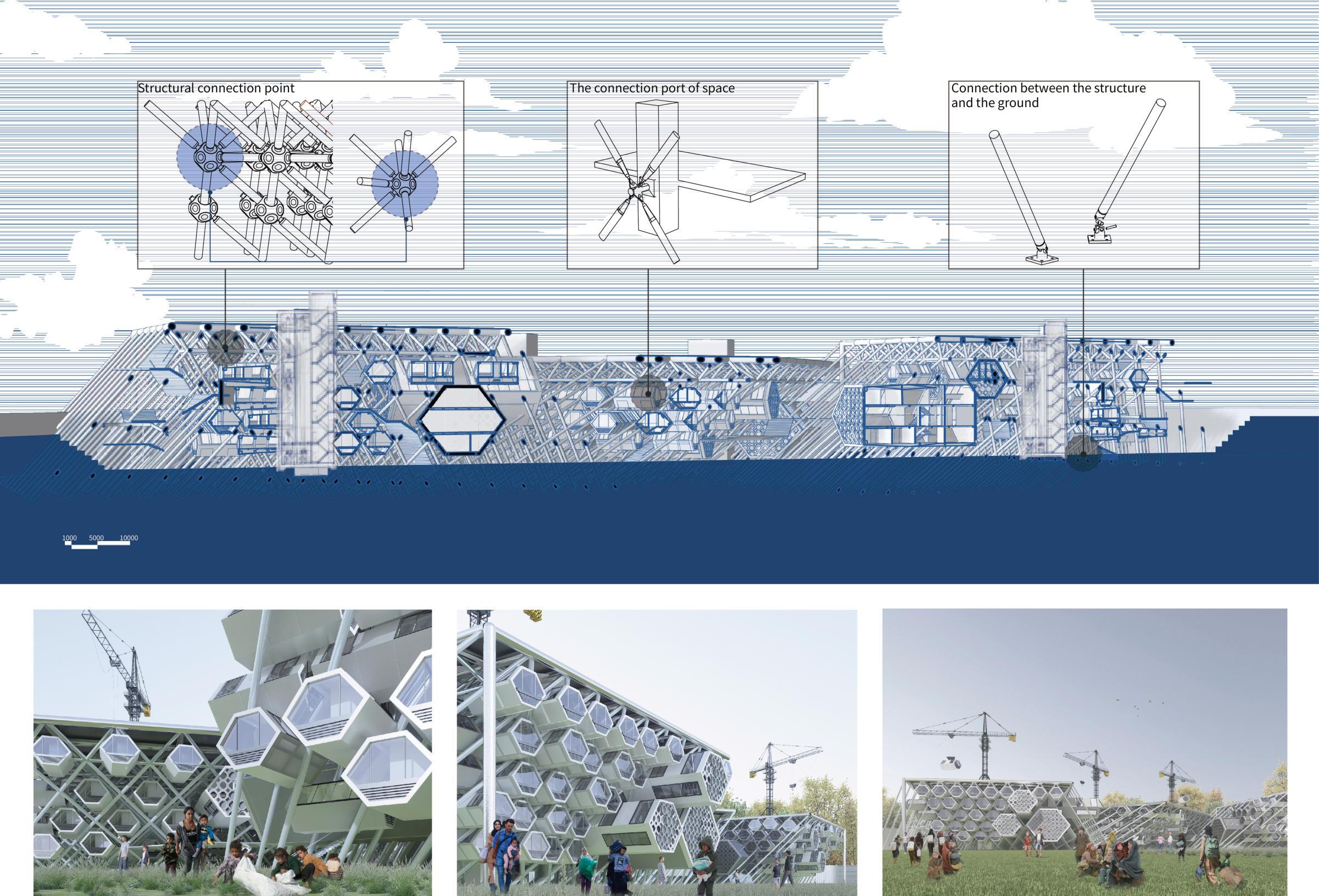 The audience area adopts exible structural methods to transform the space, which can meet different needs to assemble Spaces with different functions and achieve a reasonable distribution.Independentverticaltransportationsystemsaresetupinthemiddleofeachofthethreeareas,andinaddition,thethreeSpacesareconnected.Thegrasslandsectioncan clearouttheoriginaltentstoprovideactivityspaceforrefugees.Promotethedevelopmentofagoodrefugeecommunity.