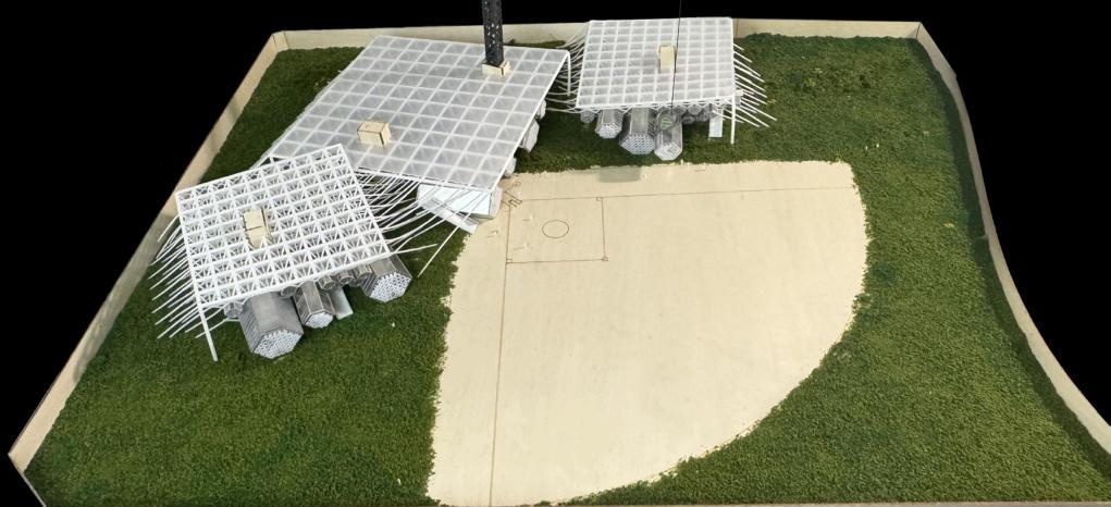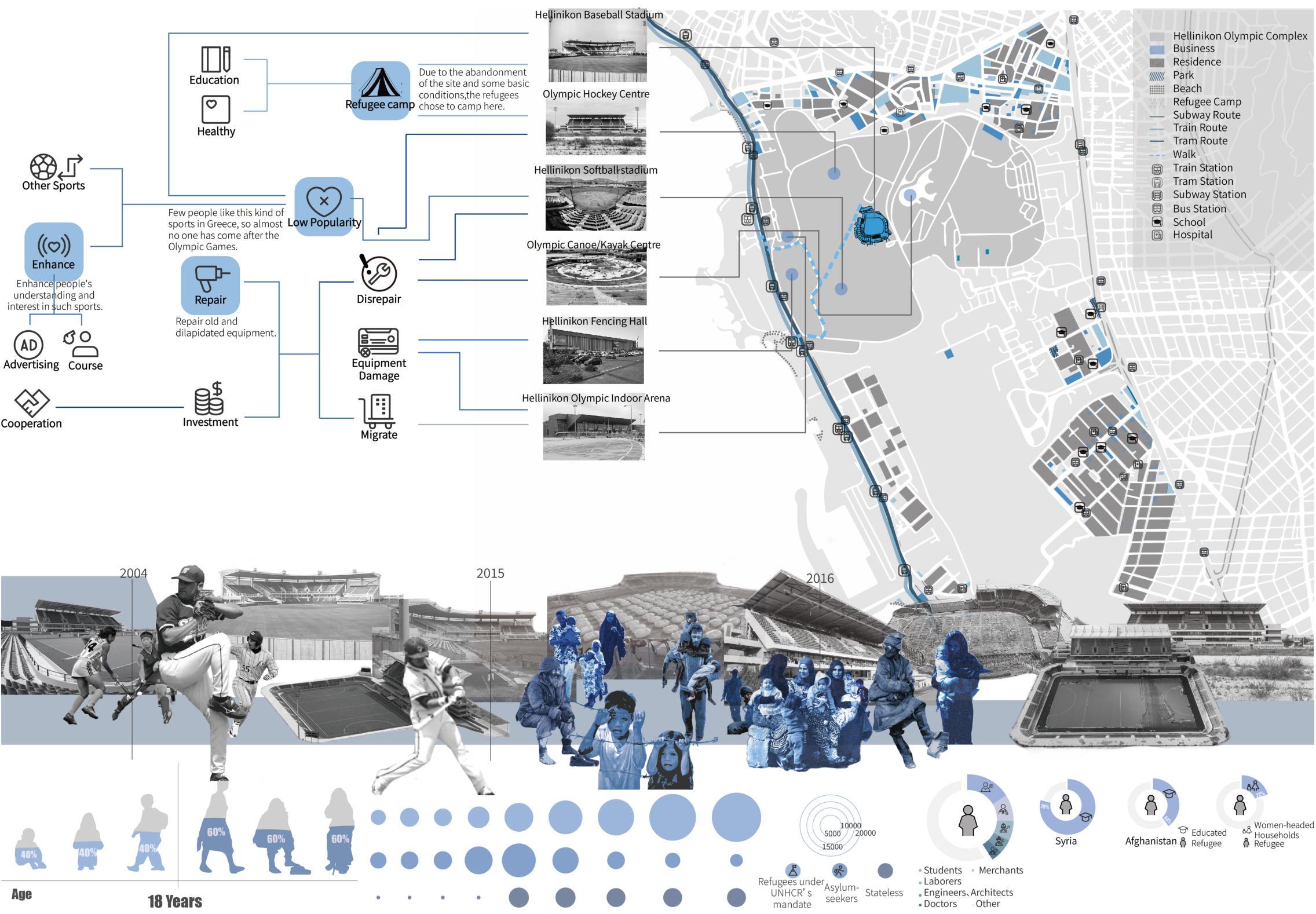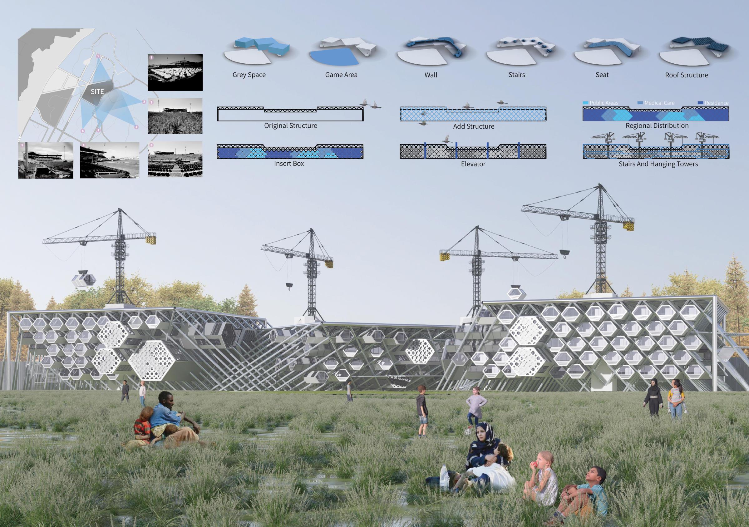 To reduce the waste of resources after the Olympics, the abandoned Olympic baseball stadium in Athens can be transformed into a community where refugees can temporarily gather. Reuse the original structure and space to provide refugees with an environment that can shelter them from wind and rainandisequippedwithinfrastructure.