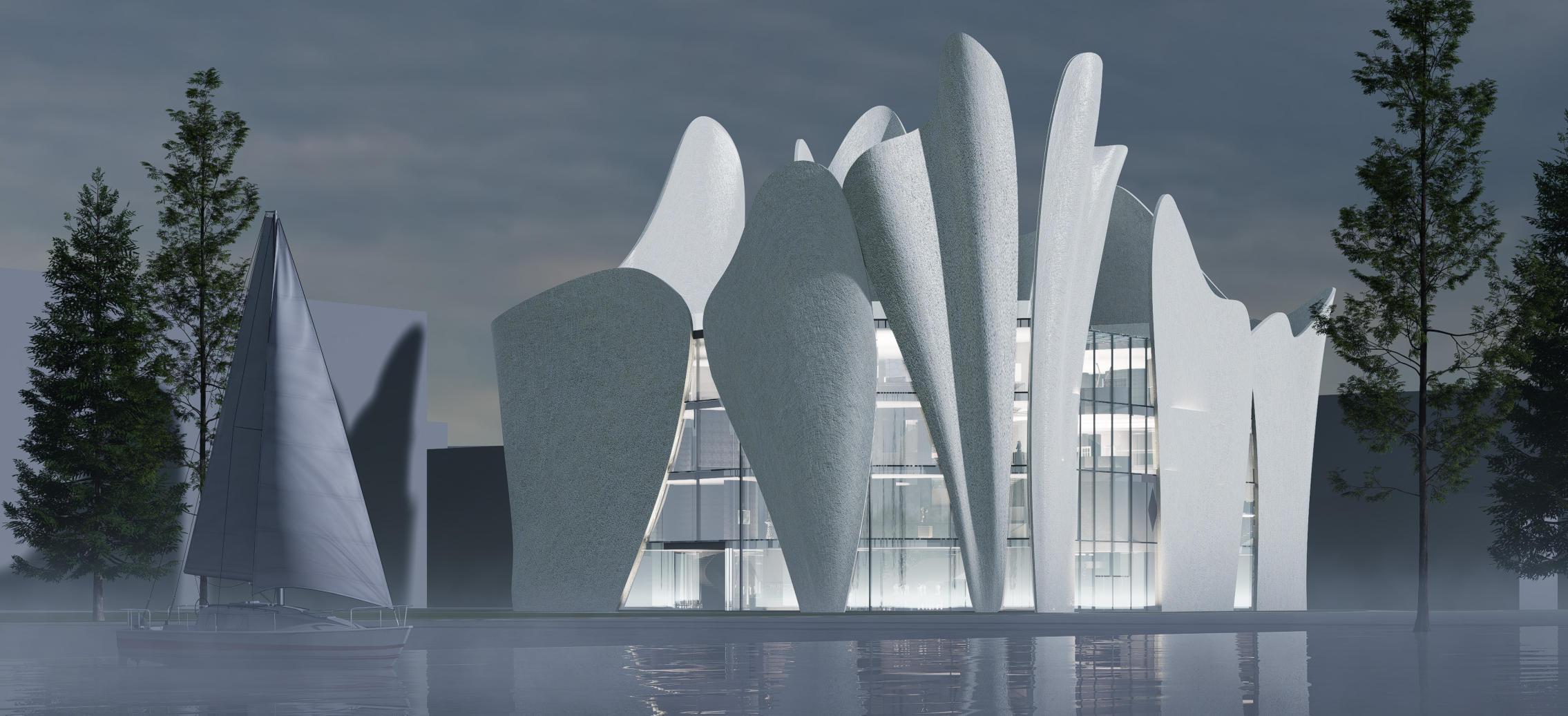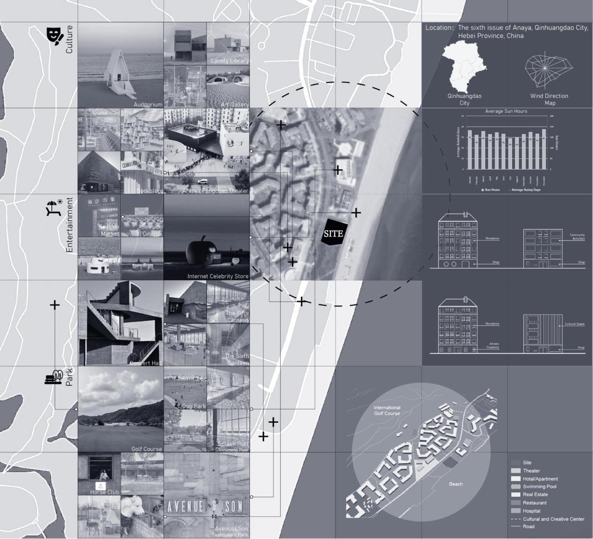 The facade combines the pleats of the costumes and the elements of waves, each with different undulations and convexity, which adds a sense of layering and enhances the visual effect. There is a large ow of people around the beach. The building is located right by the beach, and there are also three theaters not far away. Therefore, it can attract many peoplewhoareinterestedindrama.