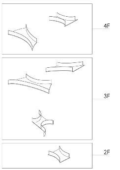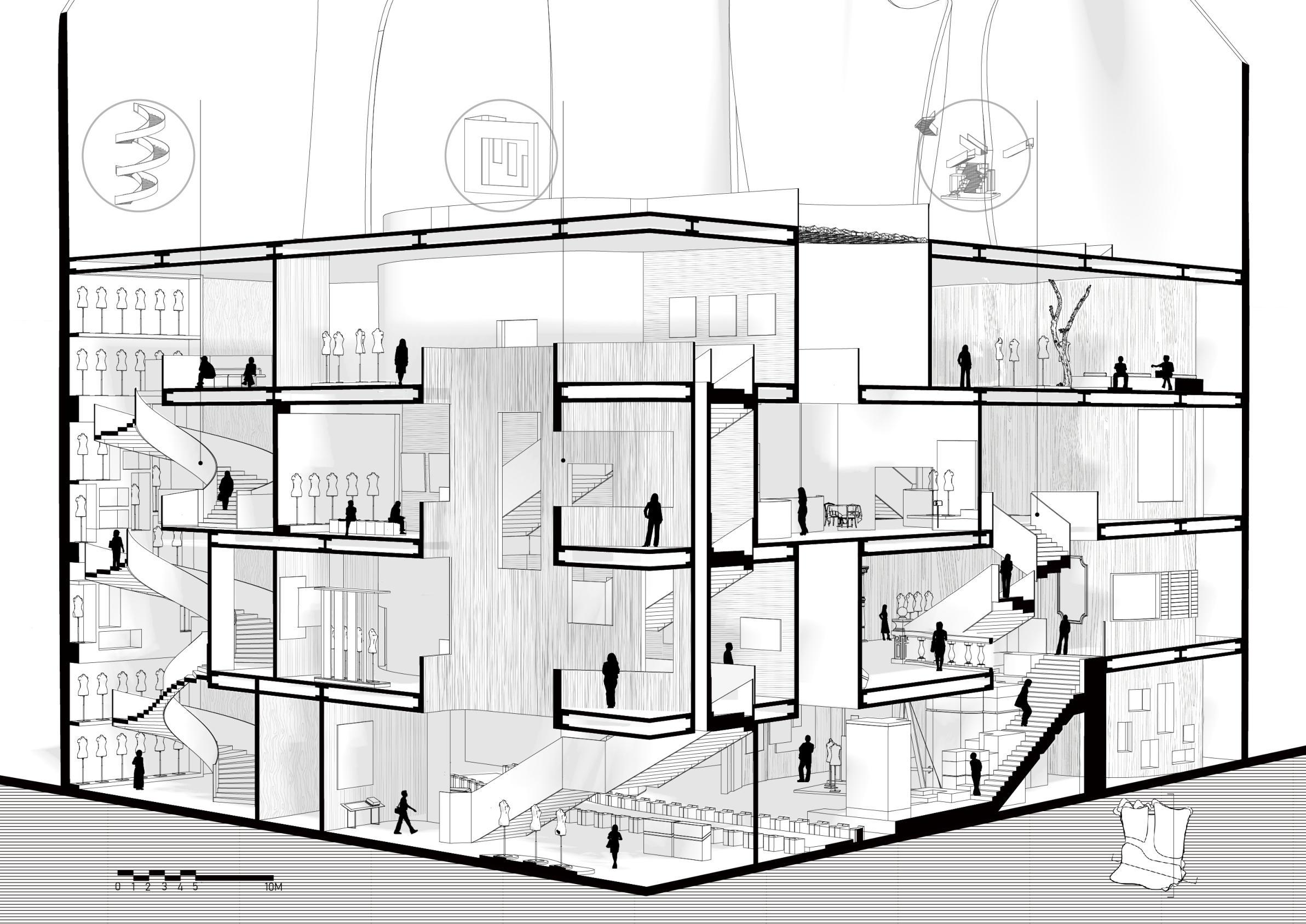 Therefore, design a stage costume museum in this place. It is located in a natural theater that coexists with the coast and humanities. Through close-up viewing of stage costumes, everyone can understand the evolution and charm of stage art from di erent perspectives. At the same time, it has an interesting interior space and a beautiful facade, which is a popular photo-op location for tourists.