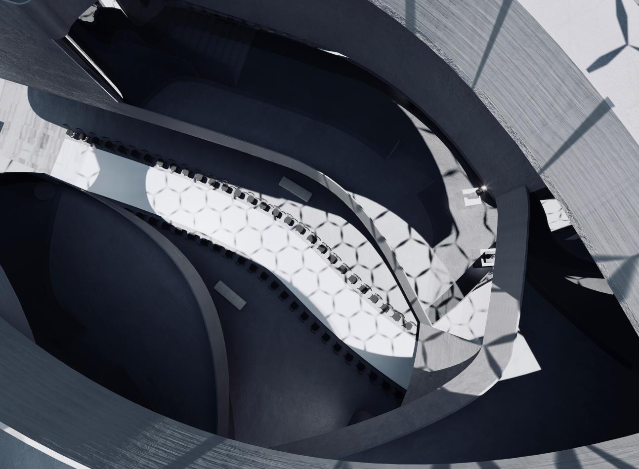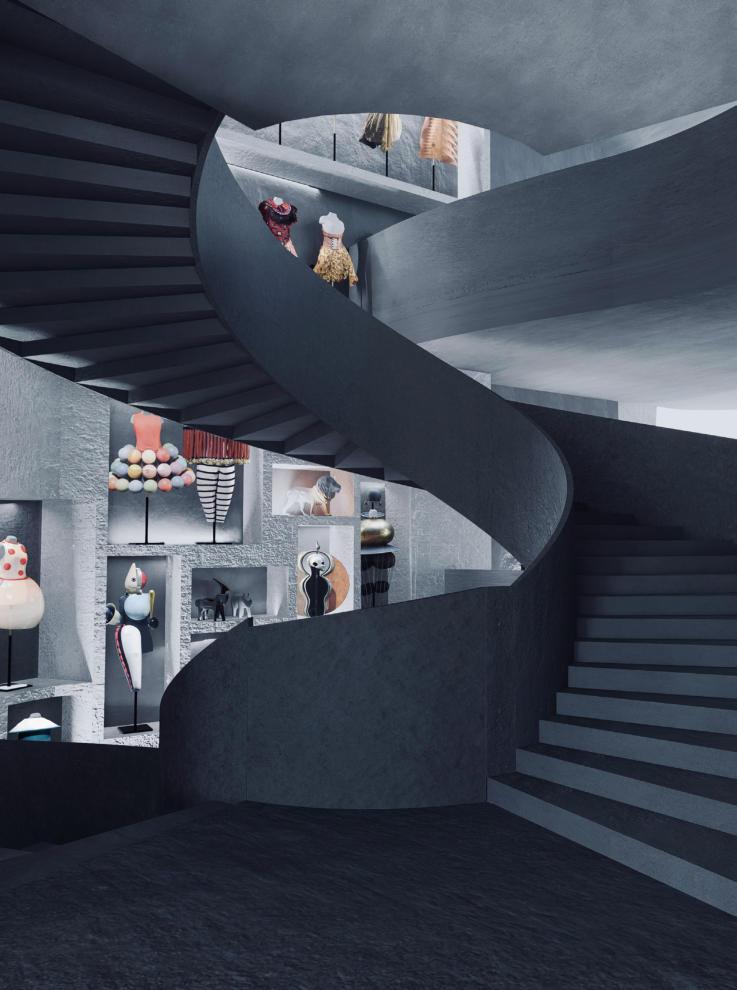 It combines a central stage with a spiral staircase running through the exhibition hall, highlighting the featureofbeingabletoviewfromallangles.Inthisway, one can experience up close the ultimate charm of fantasyandexpressivenessindramaticart.