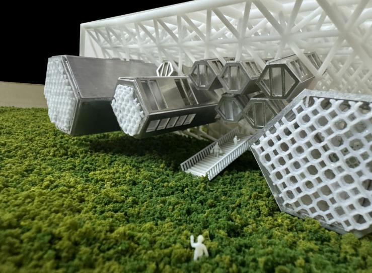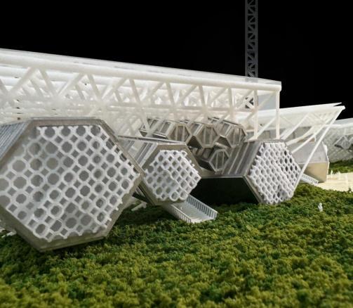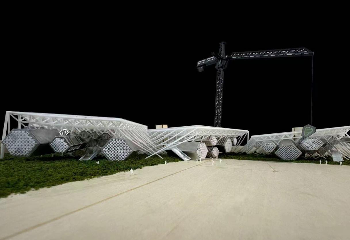 The bottom of the entire model site is made by cutting wooden boards, and the structural modification part adopts 3d printing technology. The insertion Spaces with different functions are made of aluminum alloy and acrylicmaterialsthroughlasercutting,and nallytheyareassembledonebyone.