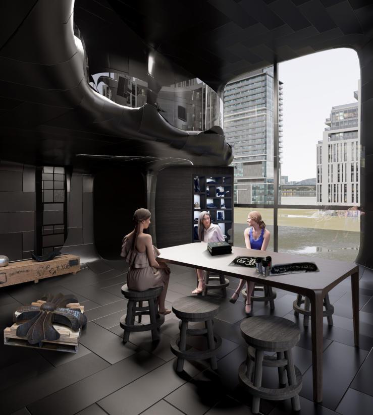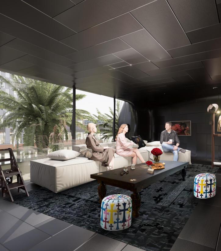The building's facade has a strong visual effect. The exterior facade is entirely black, exuding a gothic mystery while using glass for light transmission in specific areas to enhance indoor lighting and allow people to see some functional Spaces from the outside,therebyattractingpeople'sattention.