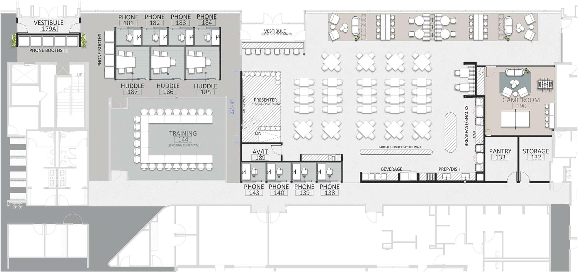 The existing break room and game room were on the second floor and Workmates would gather around a grand stair for all hands gatherings. Leadership’s goal was to create a more functional all-hands space and an environment the Workmates can ‘break bread together’.