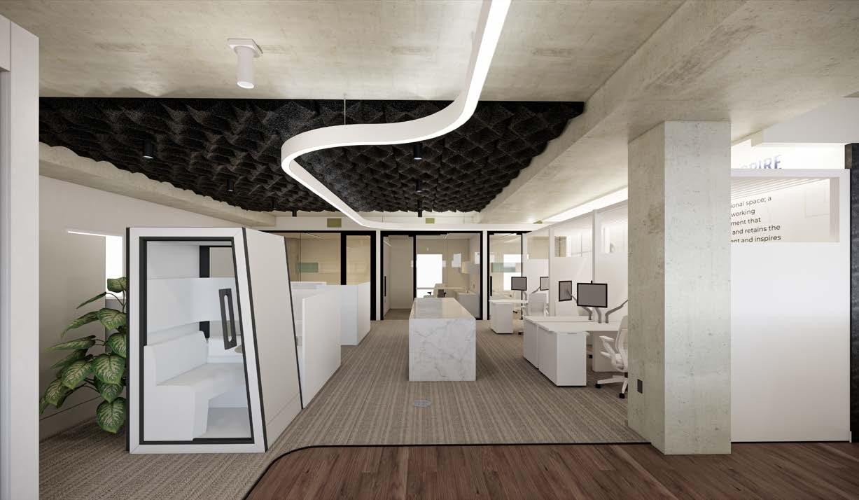 Working Spaces is a commercial design partner and furniture dealer moving to an office in the Ballpark district. They want their new space to be a destination; a space that is inviting, engaging, innovative and inspiring. They want the space to support different functions from focus work to entertaining. With this in mind, we developed our design concept: ‘As energy flows, our thoughts shift’.