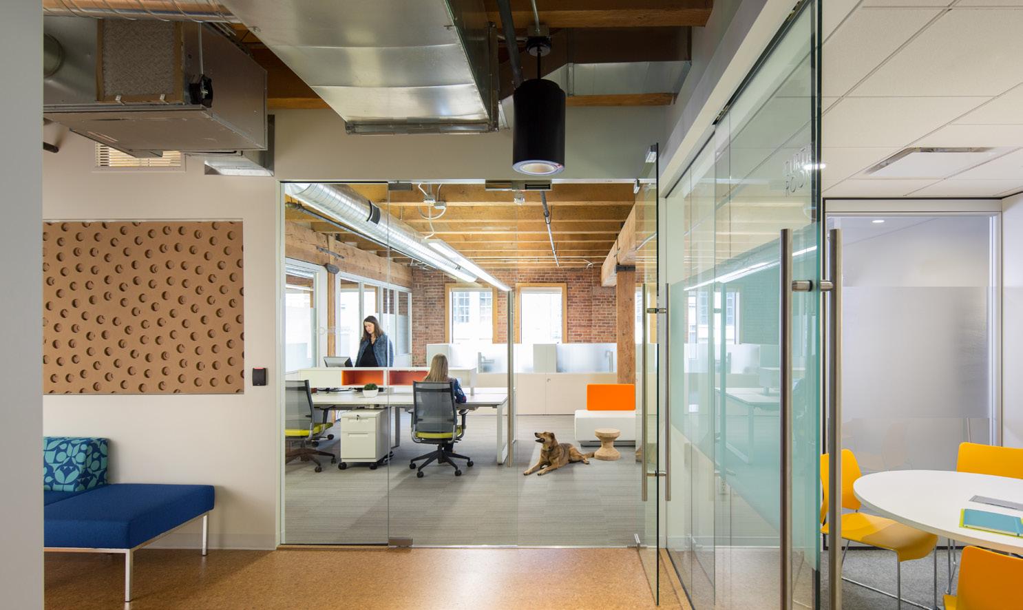 This client wanted to incorporate some of the industrial feel of its surrounding neighborhood. A challenge was the space and budget were relatively small so we had to be strategic with our design. Our solution was to keep the majority of this office simple and add interest to the spaces where we felt it would be most enjoyed, the reception and the break room.