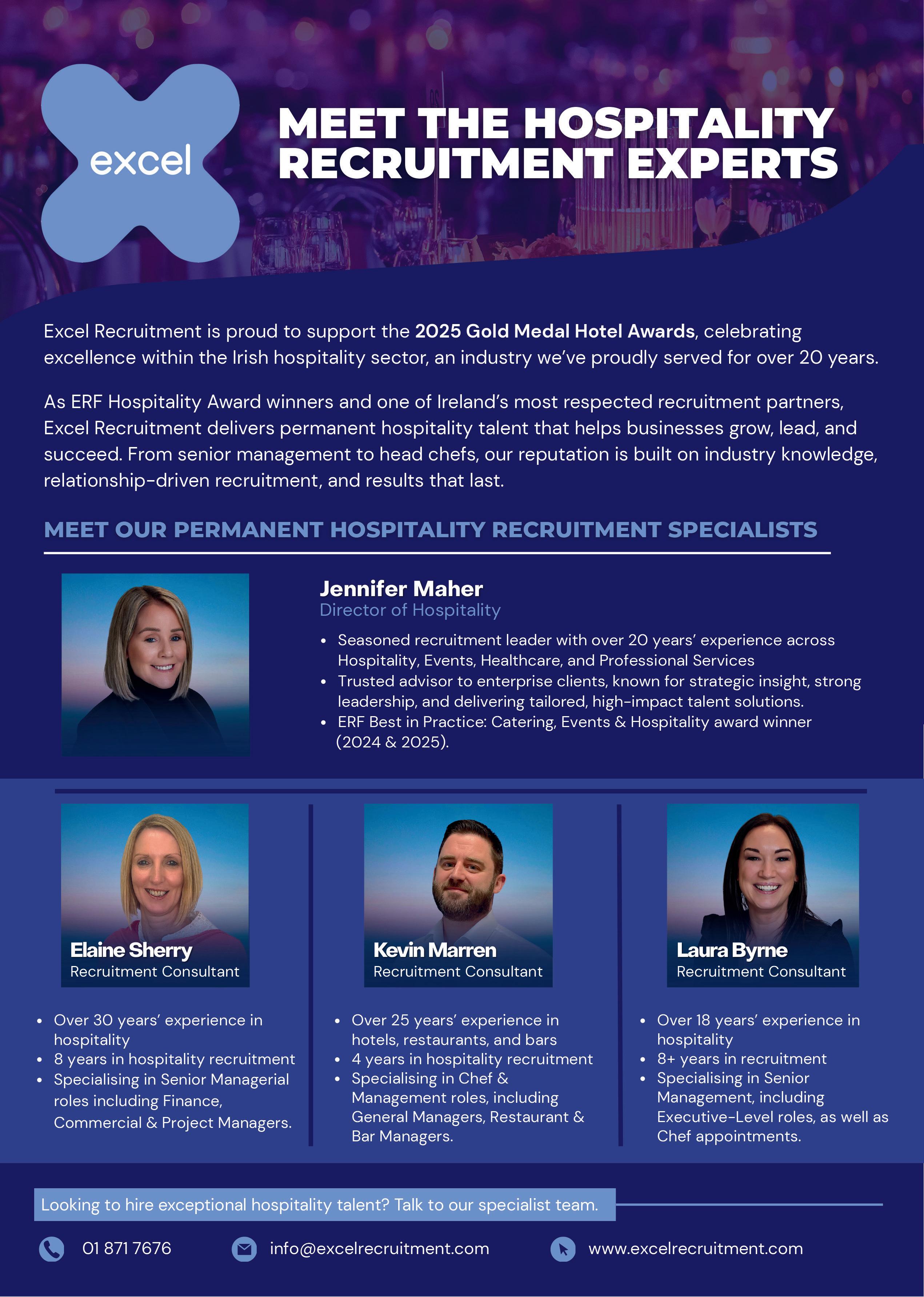 “The Hospitality Sector in Ireland continues to evolve, rising to meet the expectations of an increasingly discerning guests. This year, the judging panel journeyed the length and breadth of the country, experiencing outstanding hotels, castles, and distinctive venues set within vibrant cities, regional hubs, and areas of breathtaking natural beauty. Time and again, it was the people behind these exceptional properties who truly stood out. This evening’s winners are recognised not only for the excellence of their offerings, but—more importantly— for their unwavering commitment to delivering the highest standards of customer service. We proudly commend all of tonight’s finalists for their passion, professionalism, and dedication to excellence.”