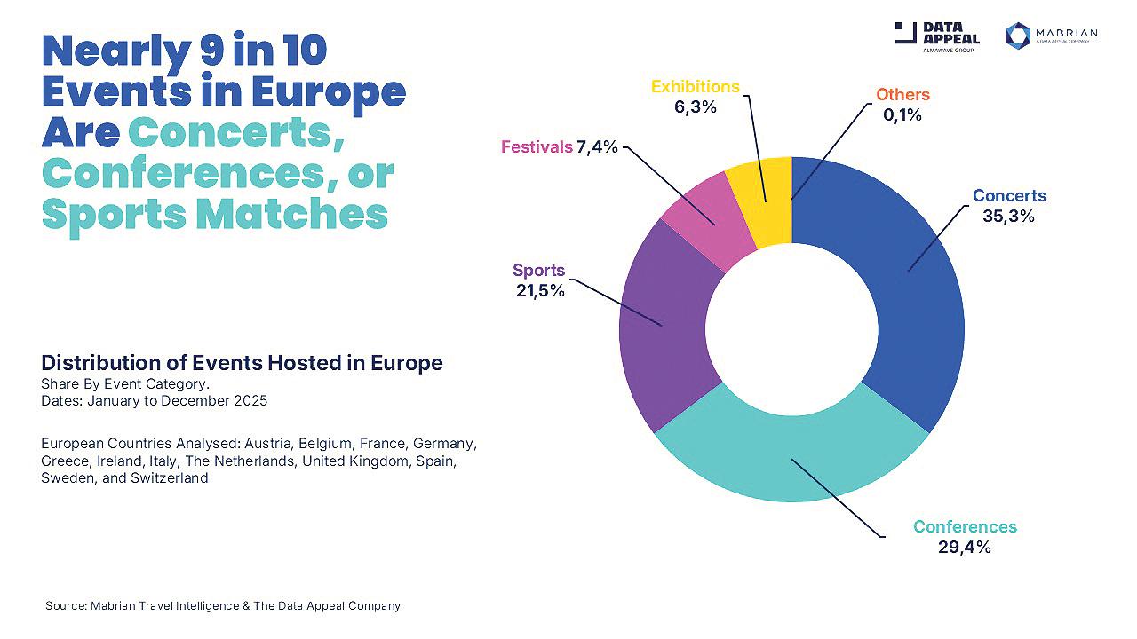 Europe’s event-driven tourism sector maintained strong momentum in 2025, with overall tourism spend rising by +7% year-on-year. That growth reflects sustained demand for live experiences and the considerable economic value they generate for local communities, according to a study by Mabrian and Data Appeal. The study draws on data from 12 European countries and shows that expos were up 4.5% in 2025 in Ireland. The data also reveals four distinct scenarios for the growth of event-related tourism spending in Europe. The first includes countries where spending rises across almost all event categories, while the second covers destinations where tourism spending around sports matches and exhibitions is increasing strongly despite declines in other categories, as seen in Ireland, Austria, Greece and the Netherlands. Across the 12 European countries studied for the report, nearly nine in 10 events held in 2025 were music concerts, professional conferences and sports matches. Concerts are particularly prominent in Ireland, Germany and France. “As events continue to grow across Europe, their true value lies in the wealth they create for local communities and their capacity to help redistribute tourism activity across territories and seasons. That is why destination event management should be closely aligned with the destination’s development and sustainability strategy,” says Carlos Cendra, Chief Marketing and Communications Officer at Mabrian.