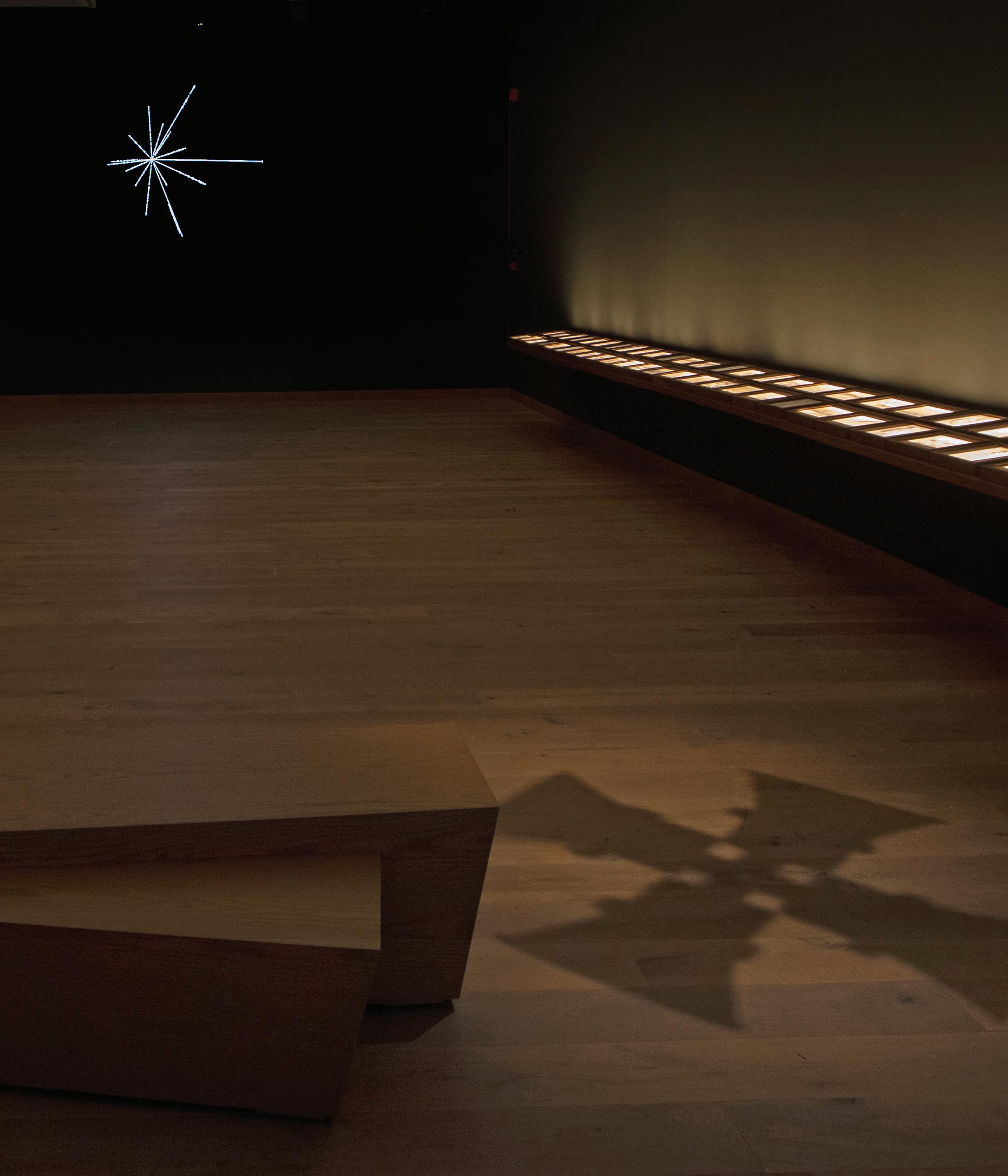 In Kallat’s hands, the Voyager’s time capsule becomes an invitation to reflect on what we choose to communicate as a species, and how we relate to the unknown. A projected Pulsar Map, decrypted audioimages of scientific diagrams, representations of flora and fauna, depictions of human anatomy and genetic makeup, and a broadcast of words of welcome in 55 languages surround visitors with poetic artifacts of planetary selfportraiture. A bench, on which viewers are invited to sit and reflect, references the hands of the Doomsday Clock, evoking the urgency of our times.