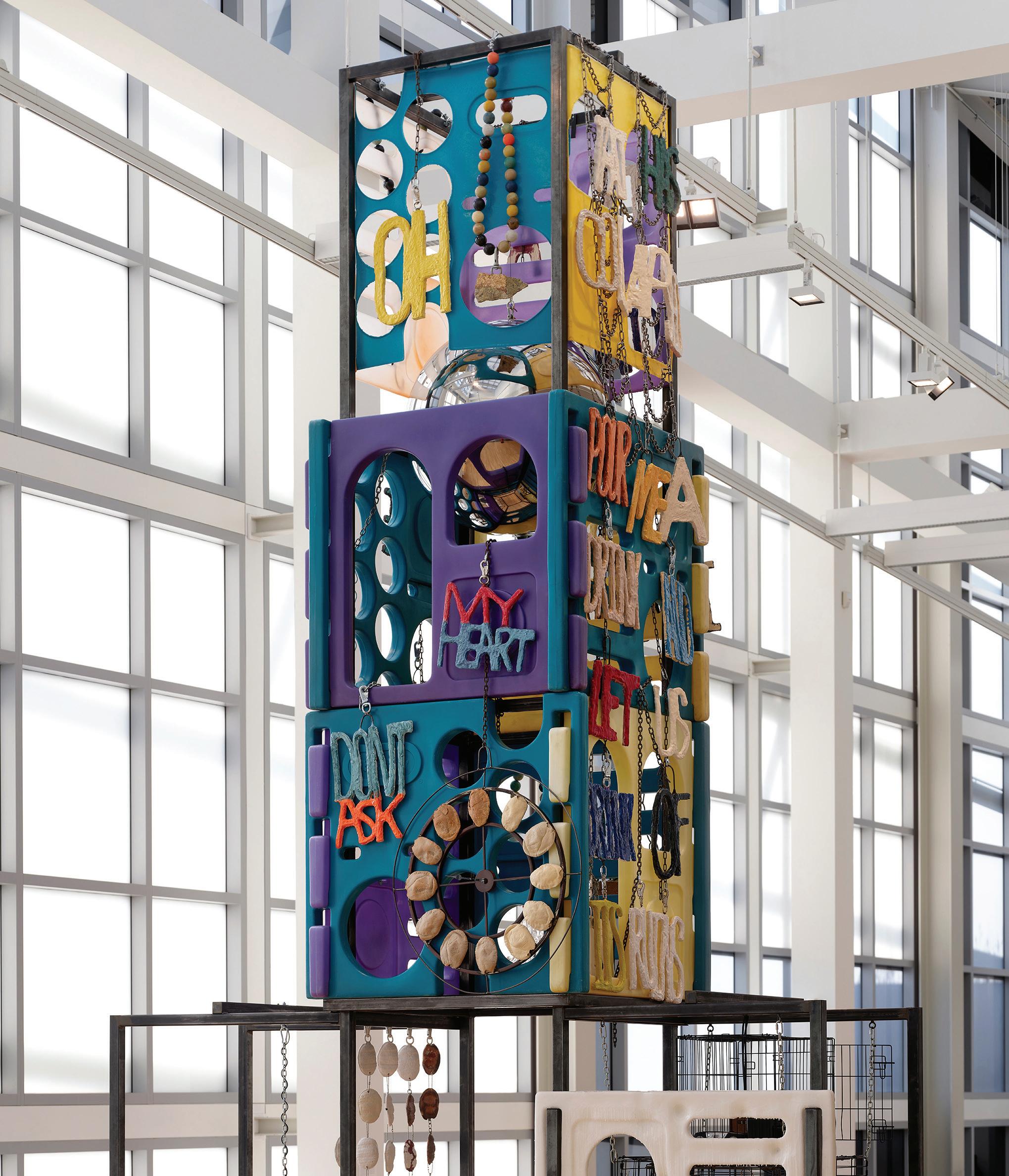 Untitled (radio tower with accessories), 2023, by Sahar Khoury. Plastic, steel, soda-fired ceramic, glazed and unglazed ceramic, anchoring resin, waxed plaster, cast glass, animal cages, wax, radios, FM transmitter, party light, timers, glass, clock, and sound. Courtesy of the artist; Rebecca Camacho Presents, San Francisco; Canada, New York; and Parker Gallery, Los Angeles. Photograph by Robert Divers