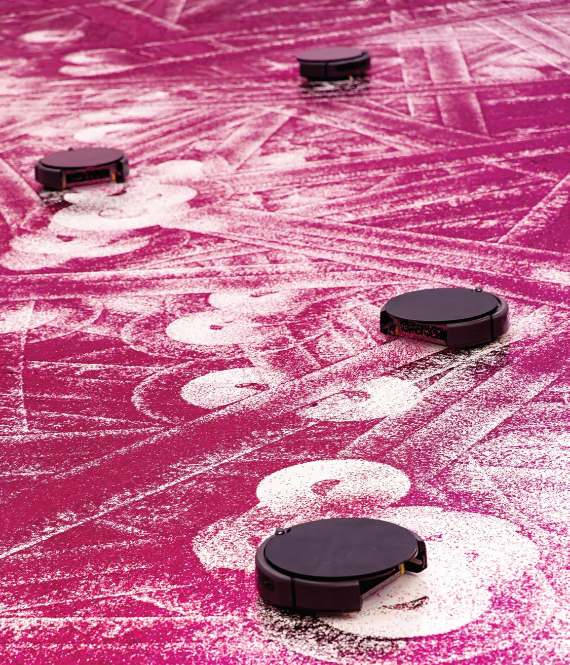 Puff Out M_2205_pink, 2017–2025, by :mentalKLINIK. Eight robot vacuums with special caps and charging units, various glitters. Courtesy of the artists. Photograph by Özge Balkan, courtesy of Borusan Contemporary.
