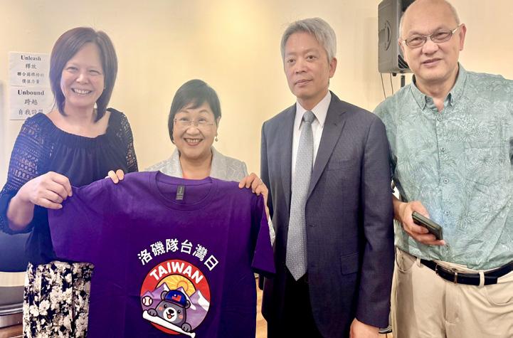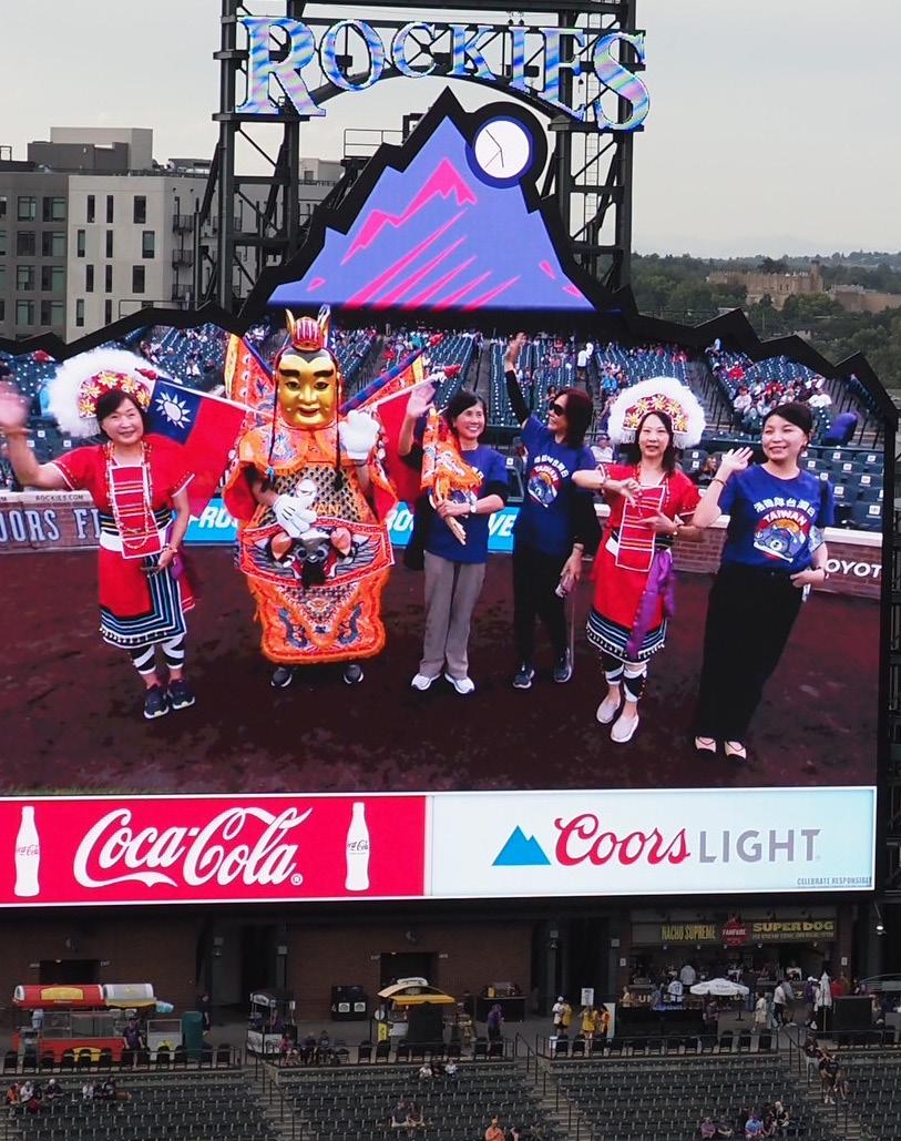 Lee; Colorado Taiwanese Association former President Rachel Chiu; and Colorado Chinese School Principal Mitchell Hong. Representatives of the Taiwanese community walked onto the stadium stage wearing aboriginal costumes, The folk legend Third Prince (Ne Zha) costumes, and Rockies Taiwan Day commemorative shirts to showcase Taiwan’s cultural characteristics to the audience.