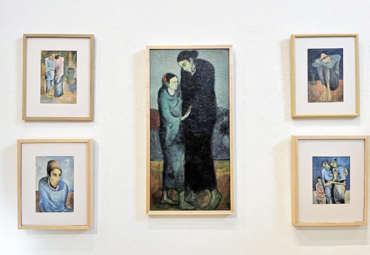 Borrowing from Picasso’s Blue Period, the figures possess elongated limbs and lyrical bodies that stretch toward one another yet remain apart. Their gazes turn downward, heavy with inner grief, while the colors