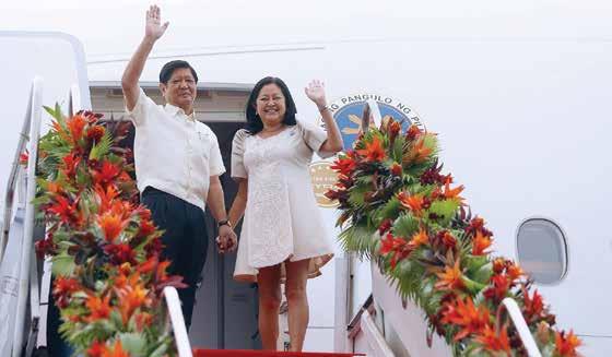 BUSINESS TRIP. President Ferdinand R. Marcos Jr. and First Lady Liza Araneta-Marcos wave to well-wishers at Villamor Air Base in Pasay City before departing for Davos, Switzerland on Sunday morning, Jan. 15. The president will attend the 53rd World Economic Forum, where he said he will draw attention to the Philippines’ efforts at building resilient infrastructure, ensuring food security, and furthering climatefriendly, clean and green energy to power the economy. PNA photo by Rolando Mailo