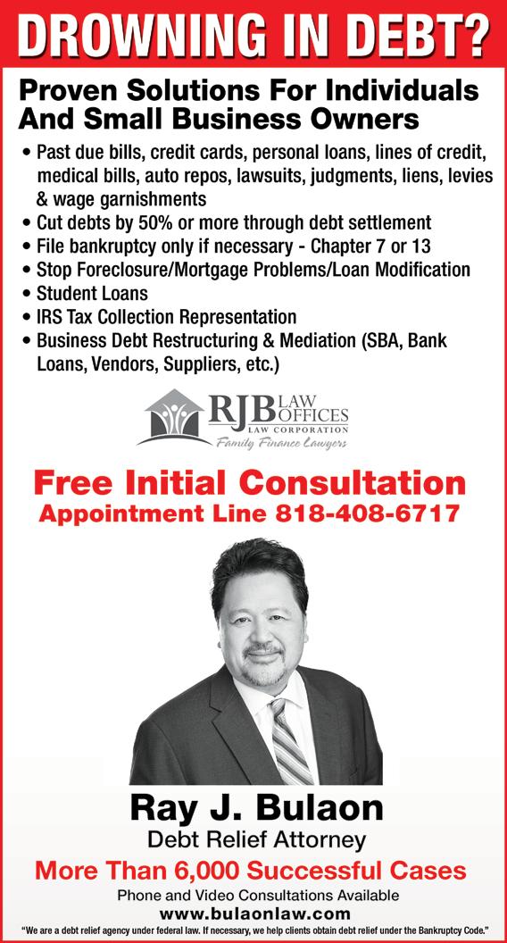 * * * Lawrence Bautista Yang specializes in Bankruptcy, Business, Real Estate and Civil Litigation and has successfully represented more than five thousand clients in California. Please call Angie, Barbara or Jess at (626) 2841142 for an appointment at 20274 Carrey Road, Walnut, CA 91789 or 1000 S. Fremont Ave., Mailstop 58, Building A-10 South, Suite 10042, Alhambra, CA 91803. (Advertising Supplement)
