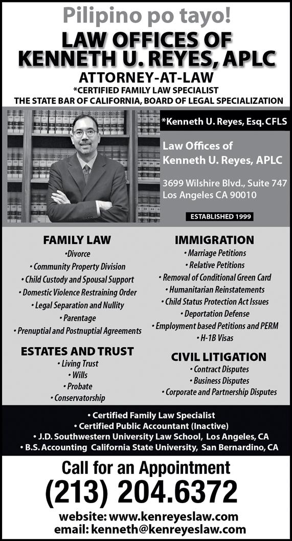 * * * Attorney Kenneth Ursua Reyes was President of the Philippine American Bar Association. He is a member of the Family law section, Estates and Trust, and Immigration law section of the Los Angeles County Bar Association. He is a graduate of Southwestern University Law School in Los Angeles and California State University, San Bernardino School of Business Administration. He has extensive CPA experience prior to law practice. LAW OFFICES OF KENNETH REYES, APLC. is located at 3699 Wilshire Blvd., Suite 747, Los Angeles, CA, 90010. Tel. (213) 388-1611 or e-mail Kenneth@kenreyeslaw.com. Web: kenreyeslaw.com. (Advertising Supplement)