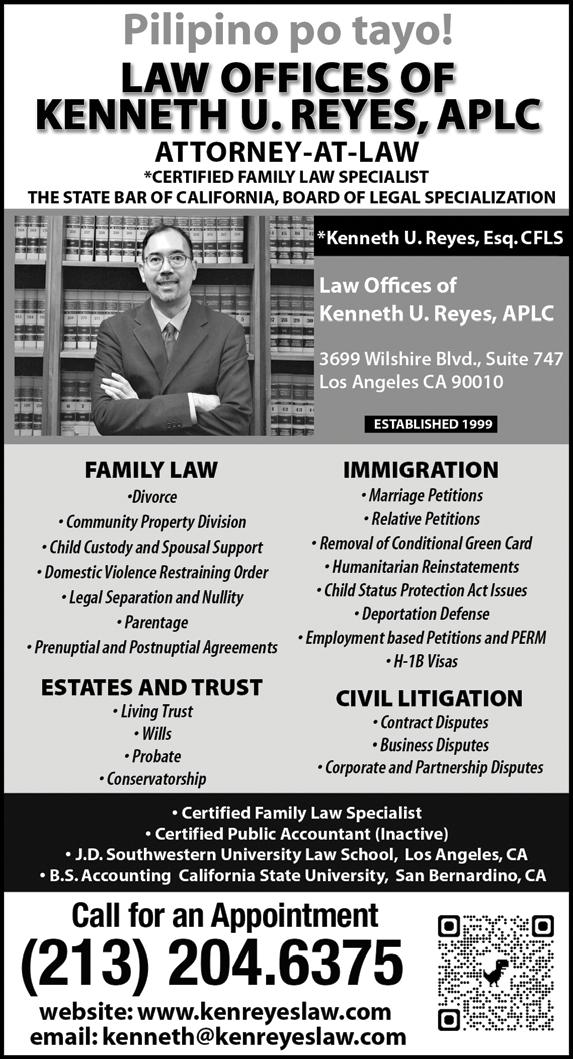 Attorney Kenneth Ursua Reyes is a Certified Family Law Specialist. He was President of the Philippine American Bar Association. He is a member of both the Family law section and Immigration law section of the Los Angeles County Bar Association. He is a graduate of Southwestern University Law School in Los Angeles and California State University, San Bernardino School of Business Administration. He has extensive CPA experience prior to law practice. LAW OFFICES OF KENNETH REYES, APLC is located at 3699 Wilshire Blvd., Suite 747, Los Angeles, CA, 90010. Tel. (213) 388-1611 or e-mail kenneth@kenreyeslaw.com. (Advertising Supplement)
