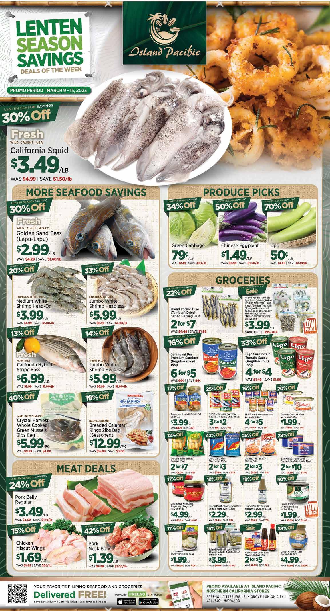 SHOP GROCERIES ONLINE DOWNLOAD THE NEW MOBILE APP EARN POINTS FOR EVERY DOLLAR YOU SPEND | NOT YET A MEMBER? TEXT BONUS TO 87573 30%Off LENTEN SEASON SAVINGS 33%Off LENTEN SEASON SAVINGS 20%Off LENTEN SEASON SAVINGS $2.99/LB WAS $4.29 | SAVE $1.60/lb WILD CAUGHT | MEXICO Golden Sand Bass (Lapu-Lapu) 30%Off LENTEN SEASON SAVINGS $12.99/PK WAS $15.99 | SAVE $3.00 NAUTILUS BRAND Breaded Calamari Rings 2lbs Bag (Seasoned) 19%Off LENTEN SEASON SAVINGS LENTEN SEASON SAVINGS DEALS OF THE WEEK PROMO PERIOD | MARCH 9 - 15, 2023 MEMBER LOYALTY $3.49/LB WAS $4.99 | SAVE $1.50/lb WILD CAUGHT | USA California Squid $5.99/LB WAS $8.99 | SAVE $3.00/lb FARM RAISED | ECUADOR Jumbo White Shrimp Headless $3.99/LB WAS $4.99 | SAVE $1.00/lb FARM RAISED | ECUADOR Medium White Shrimp Head-On Fresh Fresh SHOP AT ISLAND PACIFIC SEAFOOD MARKET NORTHERN CALIFORNIA UNION CITY, HAYWARD, VALLEJO, ELK GROVE, PITTSBURG & FRESNO. WE RESERVE THE RIGHT TO TERMINATE THE SALES PROMO WITHOUT PRIOR NOTICE. WE ALSO RESERVE THE RIGHT TO REPLACE ITEMS WITH PRODUCTS OF APPROXIMATE VALUE. NO RAIN CHECKS. NOT VALID WITH ANY OTHER COUPON OR PROMO. PRICES MAY CHANGE WITHOUT PRIOR NOTICE. OTHER RESTRICTIONS MAY APPLY.