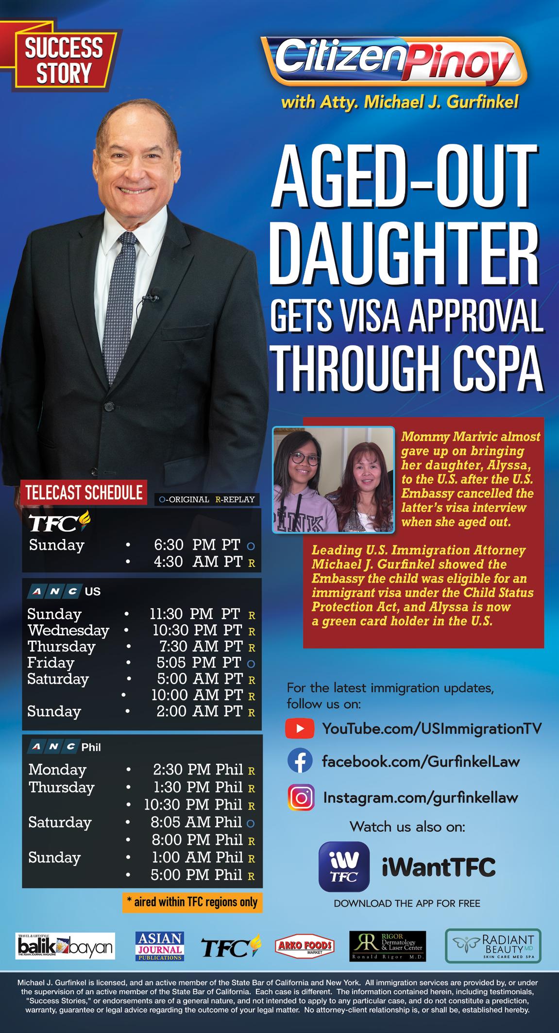 PAGE 10 “ATTORNEY-OF-LAST-HOPE” MICHAEL J. GURFINKEL (RIGHT) CONVINCED THE U.S. EMBASSY AGED-OUT CHILD WAS ELIGIBLE FOR VISA UNDER THE CHILD STATUS PROTECTION ACT, ON A BRAND-NEW SUCCESS STORY OF CITIZEN PINOY THIS SUNDAY! The U.S. Embassy cancelled the interview for Alyssa, the daughter of U.S. citizen Marivic, after Alyssa aged-out in August 2019. Desperate to find a way to bring her daughter to the U.S., Marivic wanted to explore other options like a student visa or a work visa, but Atty. Gurfinkel was able to convince the U.S. Embassy that Alyssa was eligible for an immigrant visa under the Child Status Protection Act (CSPA). Watch this success story on a brand-new episode of “Citizen Pinoy” on Sunday, March 12 at 6:30 PM PT (9:30 PM ET) through select Cable/Satellite providers, right after TV Patrol Linggo. (Advertising Supplement)