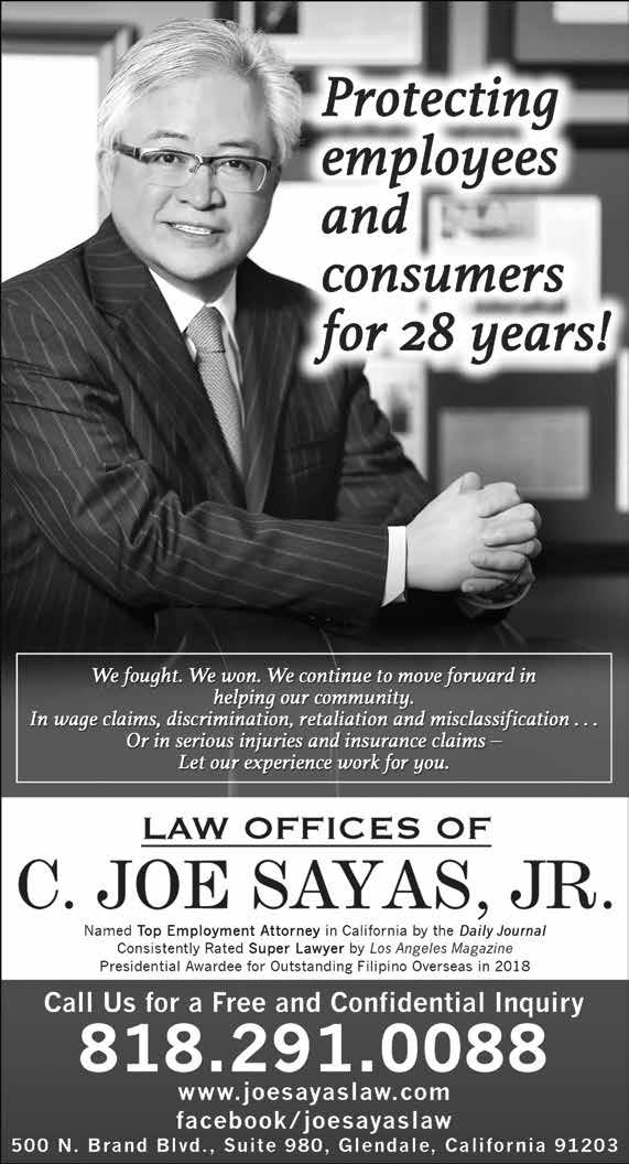 * * * The Law Offices of C. Joe Sayas, Jr. welcomes inquiries about this topic. All inquiries are confidential and at no cost. You can contact the office at (818) 291-0088 or visit www.joesayaslaw.com. [For more than 25 years, C. Joe Sayas, Jr., Esq. successfully recovered wages and other monetary damages for thousands of employees and consumers. He was named Top Labor & Employment Attorney in California by the Daily Journal, selected as Super Lawyer by the Los Angeles Magazine for 11 years, and is a past Presidential Awardee for Outstanding Filipino Overseas.]