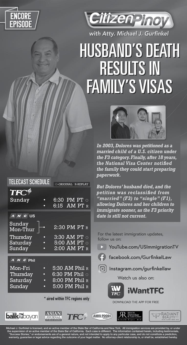 tragic situation was that Dolores and her children, Keno and Kobey, were able to immigrate to the U.S. sooner while the petitioner – Dolores’ mother and the boys’ grandmother – was still alive. Watch this success story on an encore episode of Citizen Pinoy on Sunday, April 14 at 6:30 PM PT (9:30 PM ET) through select Cable/Satellite providers, right after TV Patrol Linggo. Citizen Pinoy is also available on iWantTFC. Viewers may download the free app. (Advertising Supplement) PAGE 9