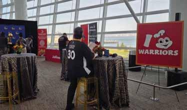 Cultural groups trP tinikling team of the thomas r. Pollicita middle school in Daly City, Dancel’s Academy of taekwondo in san Bruno, and “America’s Got talent” season 15 semifinalists sypros Bros performed during the event. Complimentary tribal-themed t-shirts were given away to filipino heritage night ticket holders. filipino-themed items such as carabao dolls with the Warriors logo and colors, were sold to the general public. this filipino heritage night marked the launch of Philippine fastfood giant Jollibee as the Warriors’ newest corporate sponsor. Jollibee hosted a pregame mixer at Chase Center’s Bayview terrace. the company also gave away free peach mango pies to filipino heritage night ticket holders.