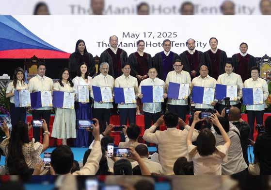 — the Commission on elections (ComeLeC) formally proclaimed the 12 winning senators of the 2025 midterm elections on saturday, may 17, in a historic and swift ceremony held at the tent City of the manila hotel. the proclamation followed the completion of canvassing across all 175 Certificates of Canvass (CoCs), certifying the vote totals that will shape the senate’s 20th Congress. the event was presided over by ComeLeC Chairman George erwin Garcia, who praised the speed and integrity of the canvassing process. eleven of the twelve senators-elect attended the ceremony in person, joined by family members and supporters. senator-elect Kiko Pangilinan was the only winner absent from the event, as he was in the United states attending his daughter’s graduation.