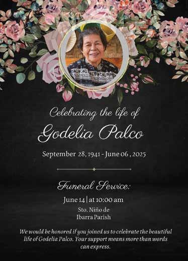 Sincerest condolences for the passing of Godelia Palco, who lived a life of grace, kindness, and unwavering faith. She touched countless lives with her gentle spirit and was a true reflection of God’s love.