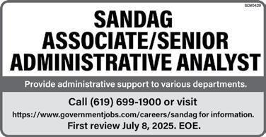 A mandatory site visit is scheduled for 9:00 a.m. on THURSDAY, JULY 10, 2025, outside the main office of Ericson Elementary School, 11174 Westonhill Drive, San Diego, CA 92126. Upon completion of the first site, contractors shall proceed to the following sites in the order listed: Walker Elementary School, 9225 Hillery Drive, San Diego, CA 92126, Foster Elementary School, 6550 51st Street, San Diego, CA 92120. Prime contractors must be present at all 3 sites. In order to bid this project. All attendees must preregister with the District prior to attending the site walk at sandiegounified.org/sitewalks. The Bid and Contract Documents may be downloaded free of charge at the District’s online Planroom at sandiegousdplans. com. All bids must be received electronically via PlanetBids before 1:00 p.m. on THURSDAY, JULY 31, 2025. Prime contractors interested in submitting a bid must go to tinyurl.com/SDUSD-PlanetBids then search under “Bid Opportunities” for “Invitation number” CC26-0153-52-00-00 Group 4B Shade Structures. For new vendors, please register under “New Vendor Registration.” The project estimate is between $1.2 million and $1.5 million, inclusive of allowances. This is a PSA project and requires prequalification. The District requires that Bidders possess any of the following classification(s) of California State Contractors License(s), valid and in good standing, at the time of bid opening and contract award: B, or other appropriate license, subject to District approval. SAN DIEGO UNIFIED SCHOOL DISTRICT, George A. Harris III, Director, Fiscal Controls and Information Systems, Facilities Planning and Construction CC26-0153-52-00-00