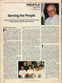 Dolphy invited me to try acting in his TV program Home Along Da Riles, but I declined the offer since I was working full-time in government. A friend who was an executive producer also invited me to appear in a film with Nora Aunor and Jaclyn Jose, but I chose instead to support Father Pierre Tritz’s SABANA (Samahan ng mga Batang Nananambakan) and help educate former child scavengers in Smokey Mountain, Tondo, Manila.