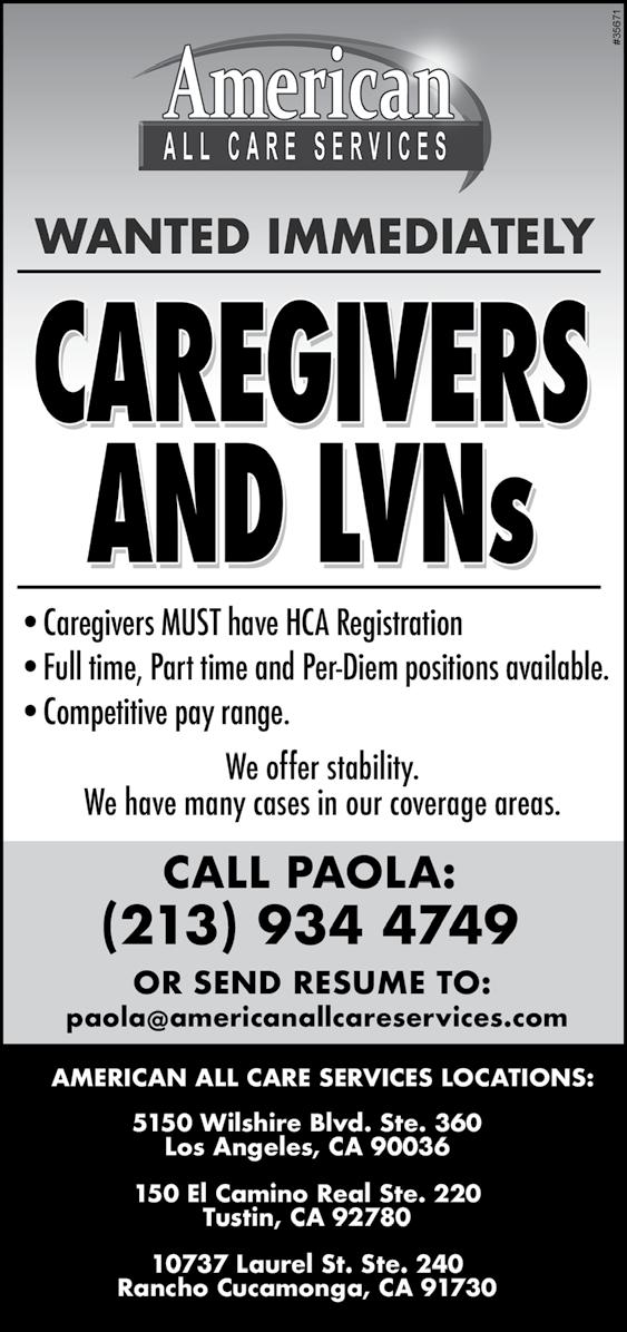 five thousand clients in California. Please call Angie, Barbara or Jess at (626) 284-1142 for an appointment at 20274 Carrey Road, Walnut, CA 91789 or 1000 S. Fremont Ave., Mailstop 58, Building A-10 South Suite 10042, Alhambra, CA 91803. (Advertising Supplement)