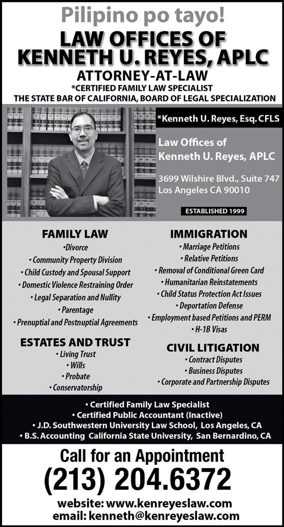 Attorney Kenneth Ursua Reyes is a Board Certified Family Law Specialist. He was President of the Philippine American Bar Association. He is a member of both the Family law section, Estates and Trusts section, and Immigration law sections of the Los Angeles County Bar Association. He is a graduate of Southwestern University Law School in Los Angeles and California State University, San Bernardino School of Business Administration. He has extensive CPA experience prior to law practice. LAW OFFICES OF KENNETH REYES, APC is located at 3699 Wilshire Blvd., Suite 747, Los Angeles, CA, 90010. Tel. (213) 388-1611 or e-mail kenneth@ kenreyeslaw.com or visit our website at Kenreyeslaw.com. (Advertising Supplement)