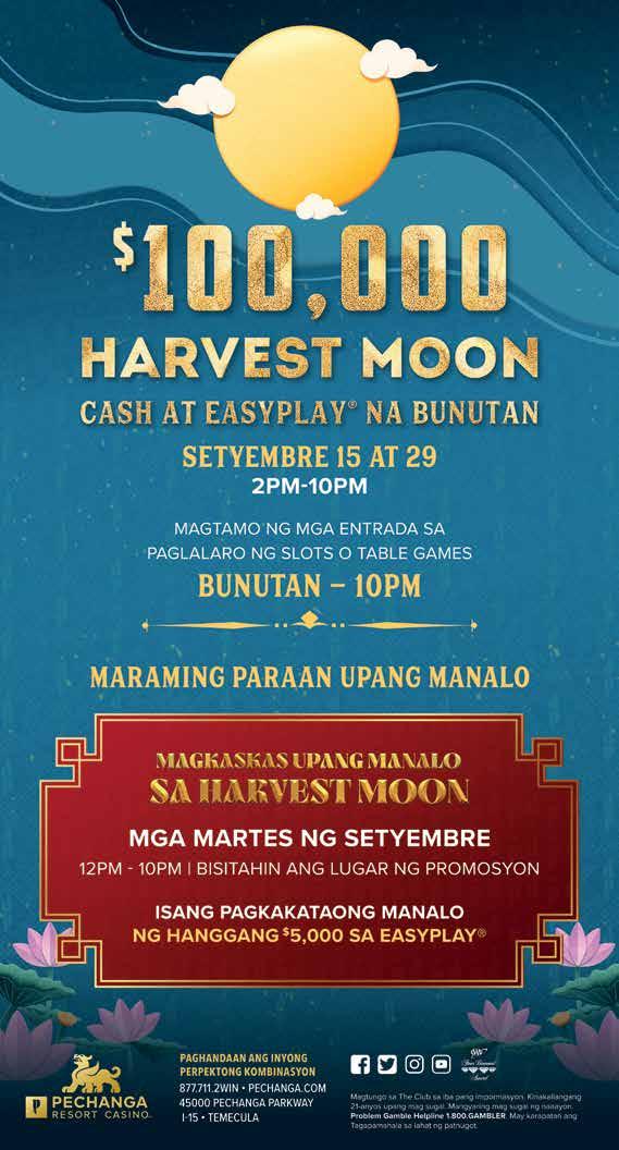 In addition, every Tuesday in September, starting from 2 p.m. to 10 p.m., Pechanga Club members can swipe their Club card at the kiosk located in the promotional area to participate in the “Harvest Moon Swipe to Win” game promotion for a chance to win up to $5,000 in EasyPlay.