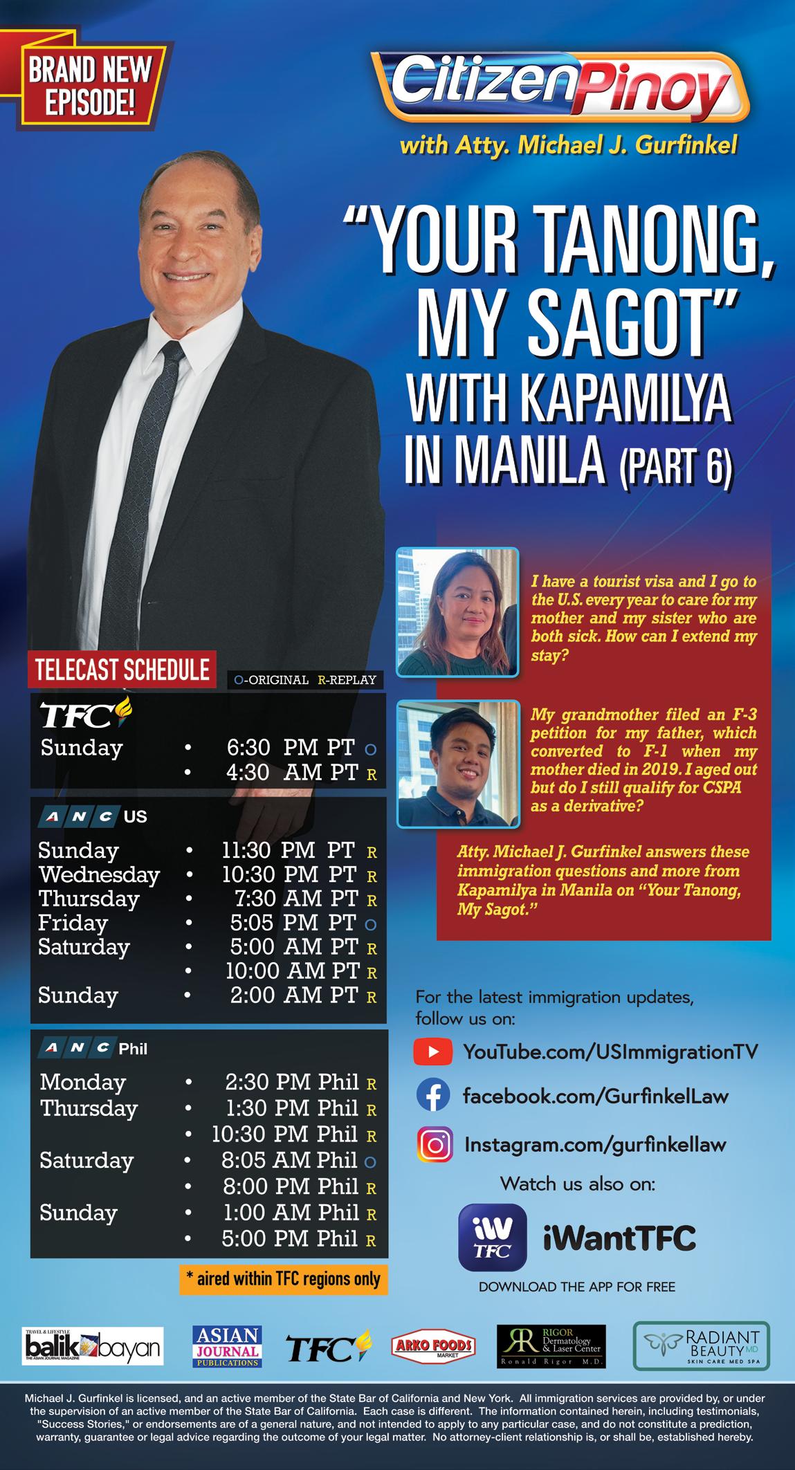 Atty. Gurfinkel answers these questions in Part 6 of “Your Tanong, My Sagot” in Manila. Watch this brand-new episode of “Citizen Pinoy” on Sunday, October 1 at 6:30 PM PT (9:30