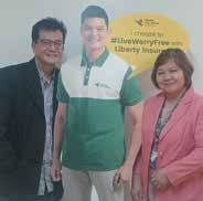 Jo Salvador (right) and Rogelio Medina flank a life-size poster of Liberty Insurance endorser Dingdong Dantes.