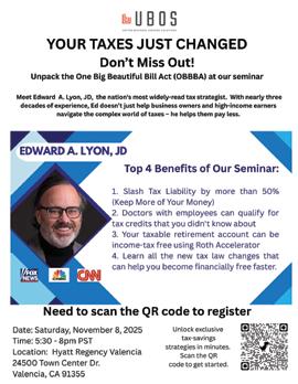 SANTA CLARITA, CA — United Business Owners Solutions (UBOS) invites Santa Clarita professionals and business owners to an exclusive seminar, “Your Taxes Just Changed – Don’t Miss Out!”, happening on Saturday, November 8, 2025, from 5:30 PM to 8:00 PM PST at the Hyatt Regency Valencia, 24500 Town Center Drive, Valencia, CA 91355. The event will unpack the One Big Beautiful Bill Act (OBBBA) and its impact on business owners, doctors, and high-income professionals. With major tax changes on the horizon, this session aims to equip attendees with the strategies needed to keep more of their income and take advantage of new tax-saving opportunities.