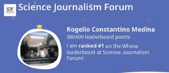 t he Philipines topped the s cience Journalism f orum (sJf) 2024 Whova Leaderboard held virtually last 28th to 31st of o ctober and participated in by renowned science journalists, communicators, editors, professors and doctoral students worldwide. Next year it will be conducted in hybrid, a mix of in-person (in UA e ) and online activities. trailing behind the Philippines were Bouda Brahim (Algiers, Algeria), Pauline Nasimiyu (Kenya), Aleem Ahmed (Pakistan), Amal magneez (Yemen), sana Jaballah (tunisia), Kennedy Kariuki (Nairobi, Kenya), marc Gbaguidi (Cotonou, Benin), Nina Portolan (Belgrade, Central s erbia), and m etwally h amza (red sea Governorate, egypt).