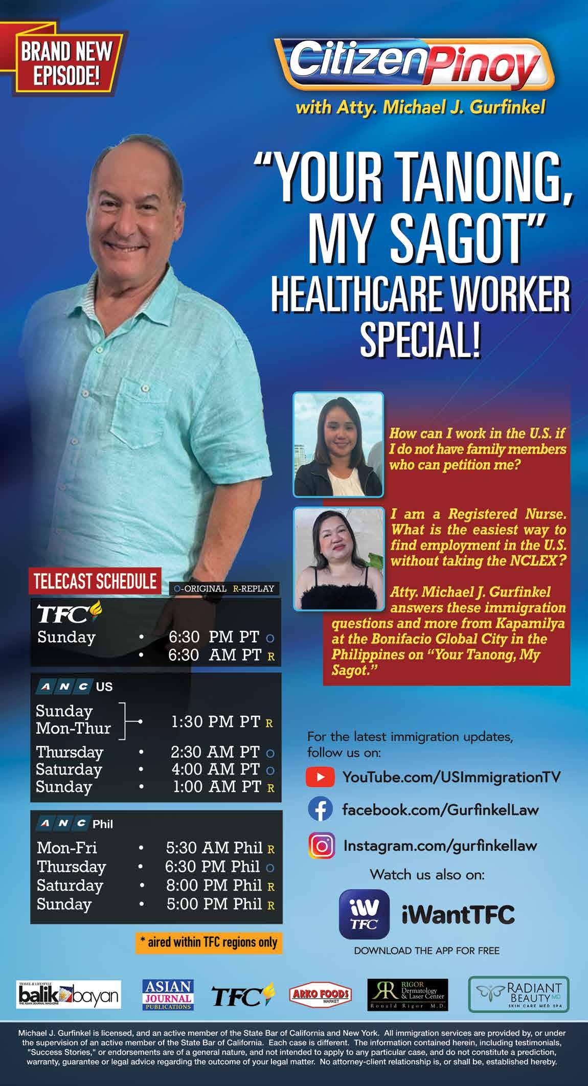 IN a brand-new episode of “Citizen Pinoy” this sunday, November 10, leading U.s. Immigration Attorney michael J. Gurfinkel addresses the critical issues of filipino healthcare workers eager to pursue nursing and caregiving jobs in the United states. recently taped at Bonifacio Global City (BGC) in the Philippines, this “Your Tanong, my Sagot” episode answers some of the most frequently asked questions in immigration law today, providing valuable insights on navigating pathways for healthcare professionals.