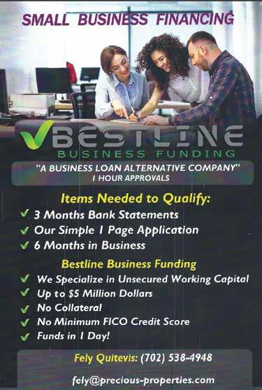 Realtor Fely Quitevis-Bateman helps those who need business financing, including loans for small businesses. For more information, call (702) 538-4948, or send email to fely@precious-properties.com or fely.precious@gmail.com.