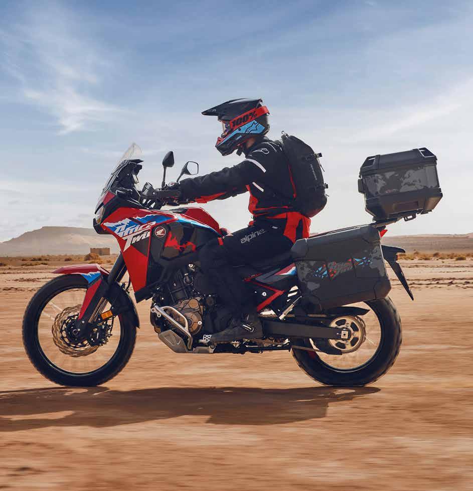 Top Box with a large capacity of 58L can store two full face helmets and much more, is designed with a new sticker made exclusively for the Africa Twin model. Its special lock allows to secure the lid without using the key.