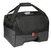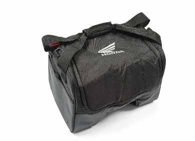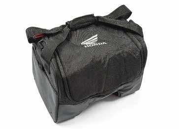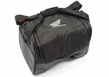 Black nylon bag with embroidered silver Honda wing logo on the top and red zippers. Comes with adjustable shoulder belt and carrying handle.