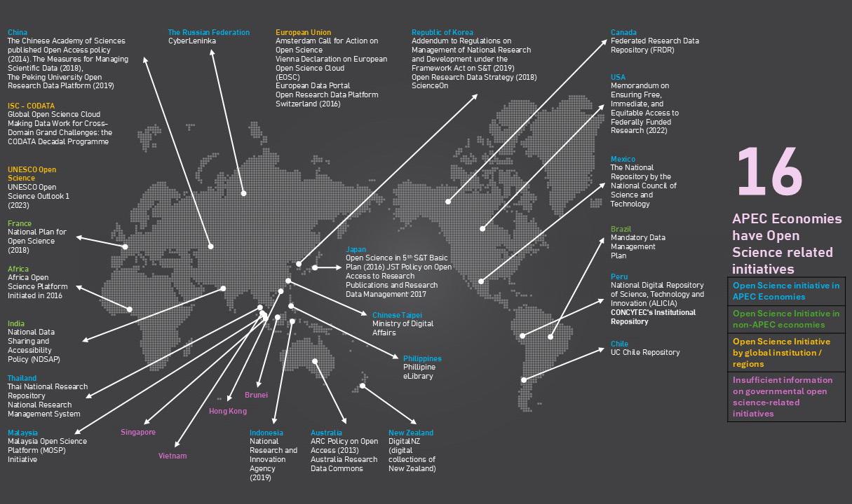 The concept of the APEC Open Science Alliance (APECOSA) was introduced by the Academy of Sciences Malaysia (ASM) in 2023 during the hosting of APEC in the United States when it was declared the year of open science. The vision of APECOSA is to ensure that APEC economies are able to tap into digital technologies to find solutions for regional and global challenges for inclusive and sustainable development; promote responsible conduct of research (transparency and avoid unnecessary duplication of research); and remove barriers to the free flow of knowledge by enabling preservation, accessibility and reusability of data. With this vision in mind, ASM, in partnership with the International Science Council (ISC), has organised two APECOSA workshops, one virtually on 20 June 2024 and a physical workshop in Lima, Peru, on 18 August 2024. The implementation of APECOSA foresees improved regional access to scientific knowledge & information amongst APEC economies and an open and reliable regional research ecosystem for democratised scientific progress. The virtual and physical workshop garnered a total of 16 speakers and moderators and 76 participants from 19 APEC economies and 3 non-APEC economies. Based on inputs from the APECOSA workshops, surveys, and desktop research, this report will provide an overview of the open science initiatives in Australia, Canada, Chile, the People’s Republic of China, Indonesia, Japan, the Republic of Korea, Malaysia, Mexico, New Zealand, Peru, Philippines, Russian Federation, Chinese Taipei, Thailand and the United States of America. Some examples were also drawn for global open science initiatives and how APECOSA can help to address the gaps and challenges in the APEC region. The open science initiatives can be illustrated in the map.
