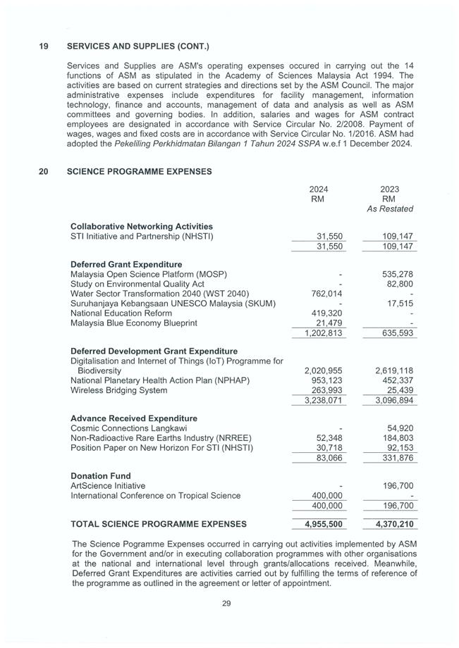 Mengembangkan jangkauan penglibatan tempatan ke antarabangsa, ASM telah melaksanakan beberapa projek sepanjang tahun 2024. Tropical Science Foundation telah menganjurkan International Conference on Tropical Sciences 2024 di Kuching, Sarawak, bagi memajukan bidang sains tropika, selaras dengan kedudukan Malaysia sebagai hab penyelidikan tropika yang unik. Persidangan ini telah dihadiri oleh lebih 300 peserta dari 20 buah negara. ‘Deklarasi Kuching untuk Tropika’ telah dihasilkan, menegaskan keperluan mendesak untuk semua pemegang taruh supaya bekerjasama dalam melindungi kawasan tropika demi masa hadapan yang lebih lestari.