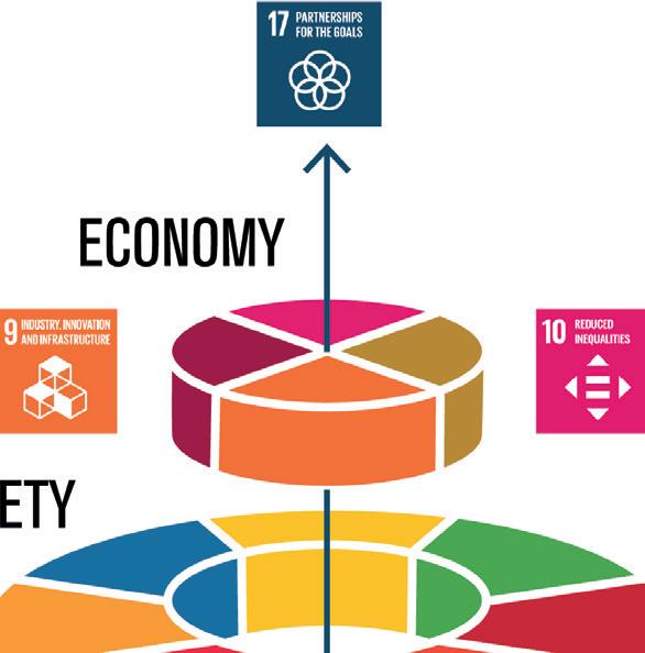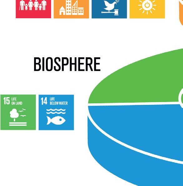 2 Biosphere Goals (the foundation): SDG 6 (Clean Water and Sanitation), SDG 13 (Climate Action), SDG 14 (Life Below Water), SDG 15 (Life on Land). Societal Goals (the middle layer): SDGs on health, education, equity, peace and institutions, such as SDG 1 (No Poverty), SDG 3 (Good Health and Wellbeing), SDG 5 (Gender Equality), SDG 11 (Sustainable Cities), SDG 16 (Peace, Justice and Strong Institutions). Economic Goals (the top layer) SDG 8 (Decent Work and Economic Growth), SDG 9 (Industry, Innovation and Infrastructure), SDG 12 (Responsible Consumption and Production).