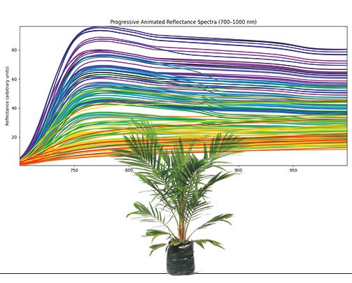This project began from a scientific study using near-infrared (700–1000 nm) spectroscopy to examine the spectral response of young oil palm leaves. The research showed that NIR reflectance — an invisible light just beyond the red edge — can detect drought stress earlier than visible symptoms, revealing its agronomic significance and opening space for artistic interpretation.