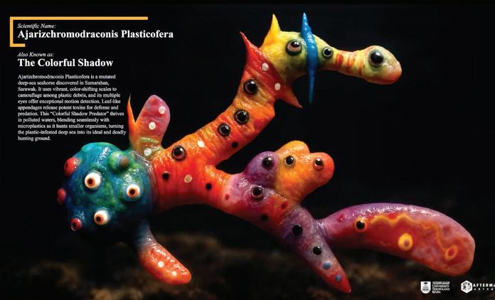 The artwork now transforms into a short documentary video, presenting these AI-enhanced creatures in motion. Using animation and generative tools, each creature is brought to life within digitally recreated habitats made from textured scans of real plastic waste collected from rivers and communities across Sarawak. AI contributes not only to the visual realism and motion of these creatures but also to the emotional resonance that helps simulate behavioural traits and reactions as if they were truly alive. This integration of technology reflects the theme, showing how machine learning can amplify ecological storytelling without compromising on message or materiality.