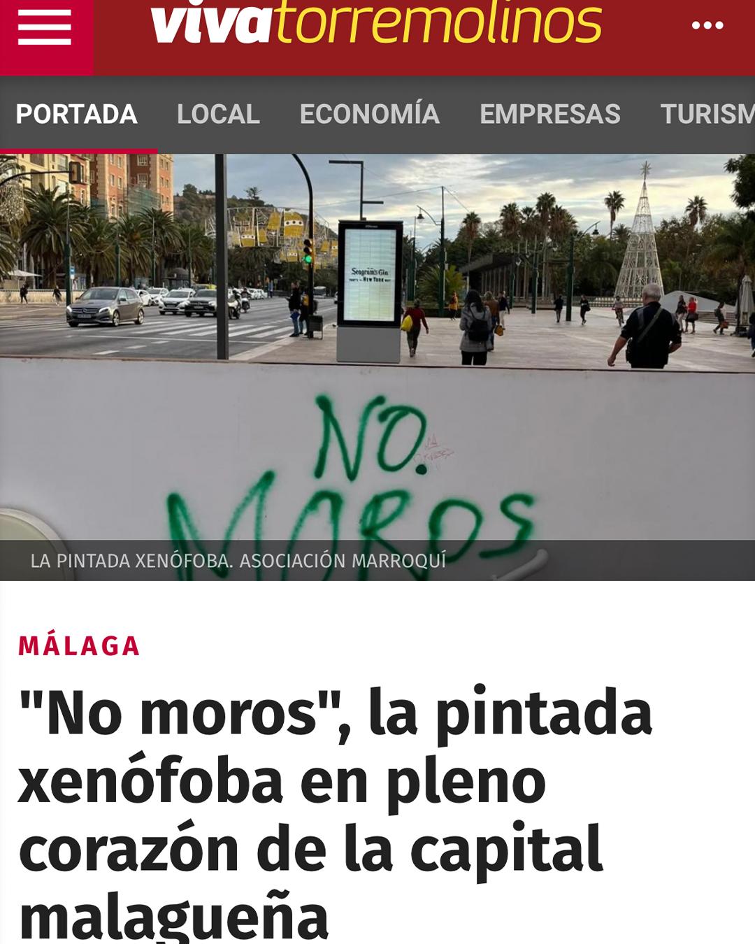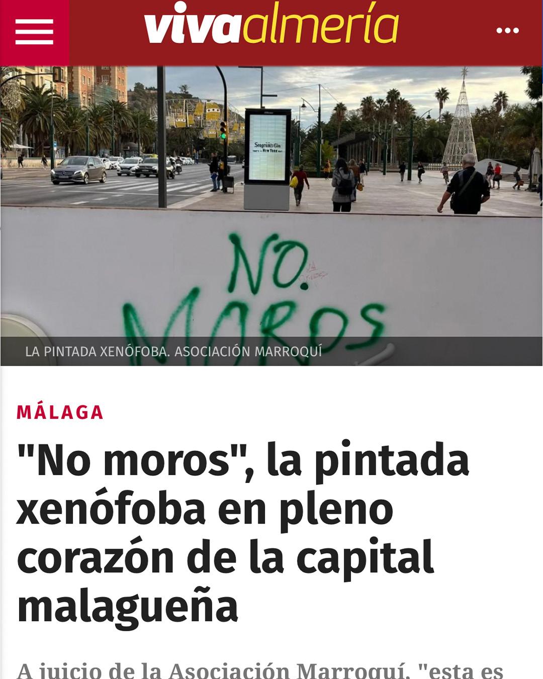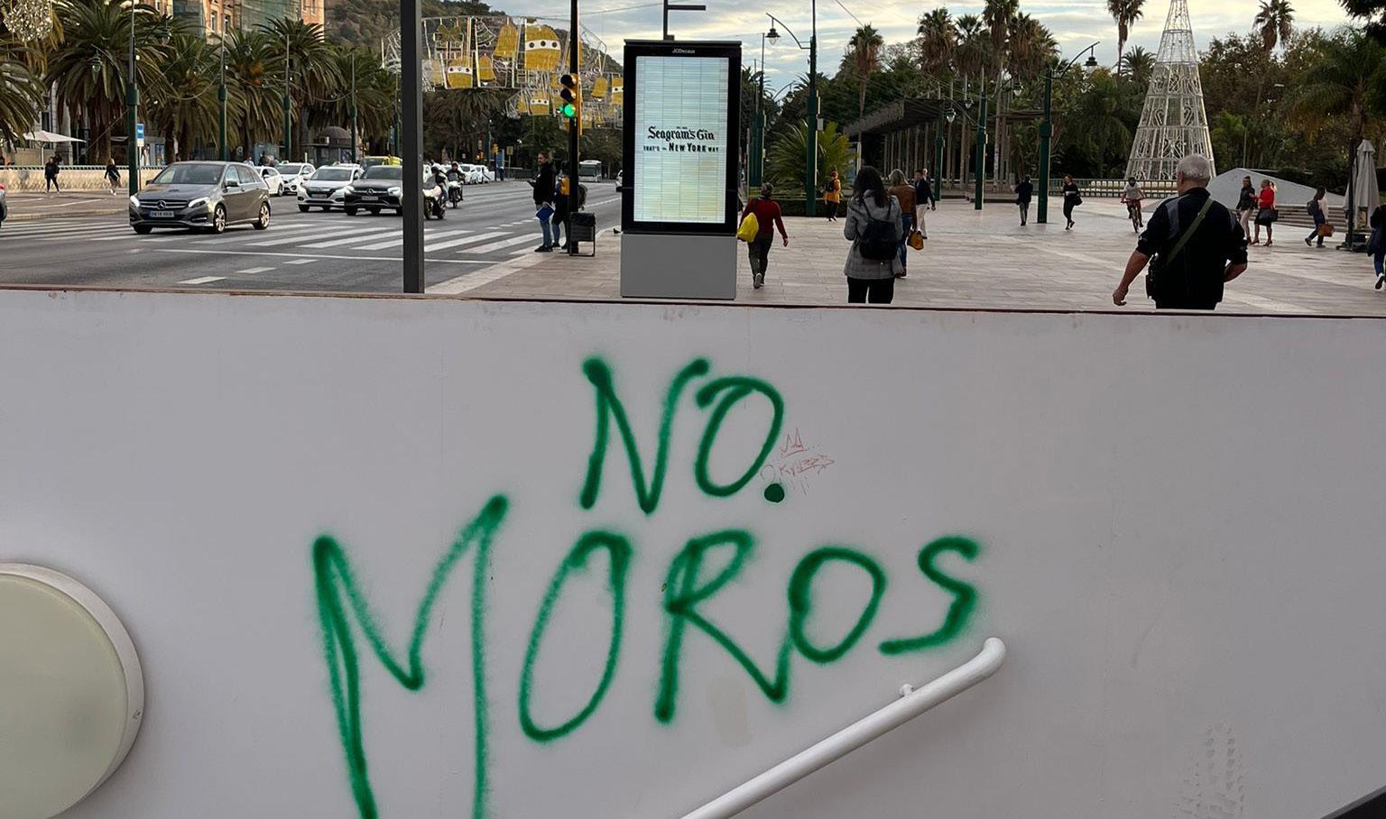 El 15 de noviembre de 2022 una de nuestras trabajadoras se encontró de camino a la sede principal de la Asociación Marroquí para la Integración de Inmigrantes una pintada en pleno centro de Málaga que enunciaba “NO MOROS”. Casualmente, se situaba al lado de un MUPI en el que días antes se había anunciado el IV Congreso Nacional Desmontando la Islamofobia. Decidimos denunciarlo a través de nuestras redes sociales, así como pedir a las autoridades competentes borrar la pintada lo antes posible. Varios medios locales visibilizaron la situación. Dos semanas más tarde, Málaga amaneció sin esta pintada.
